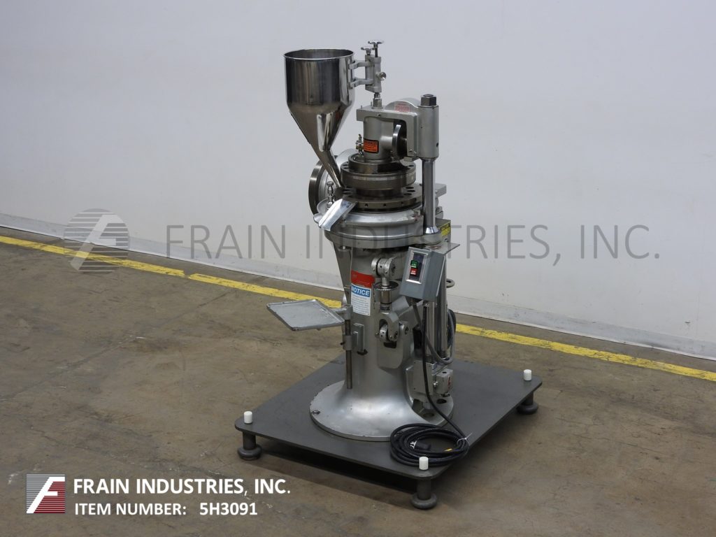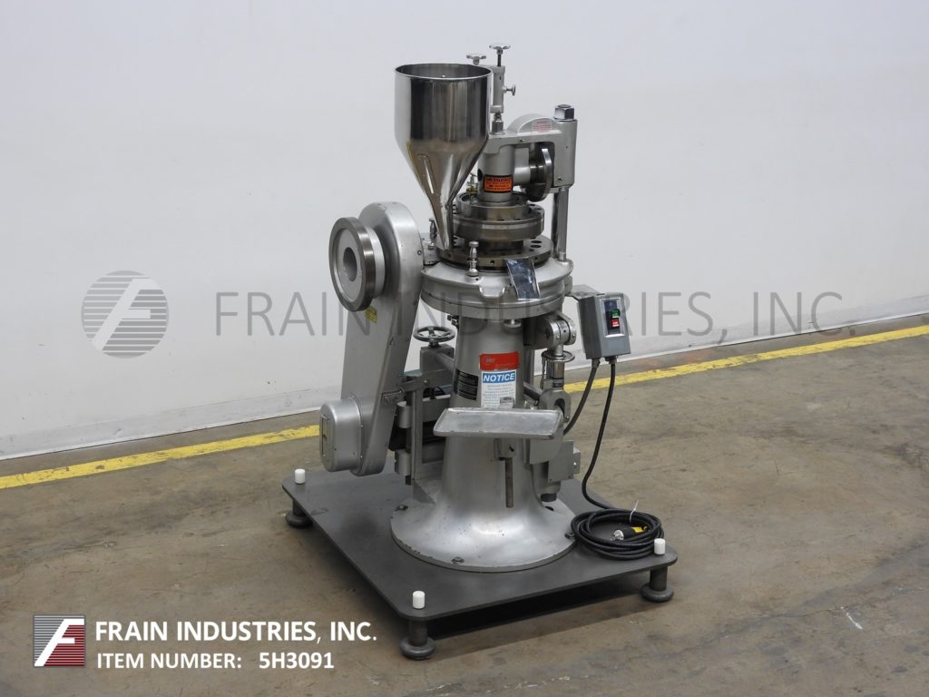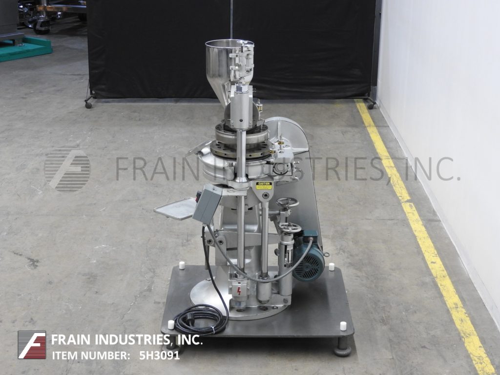 返回所有设备关键国际,型号CMD3, 16工位轮转压力机,额定从350至650片每分钟-取决于材料,应用,机器配置和环境运行。压缩:高达8.5吨。最大片剂直径(15/16)";最大填充深度(13/16)”。配备1"外径键控上冲头和1½"外径模具和2马力电机到链轮驱动。安装在48“x 42”底座框架。客户提供模具。
