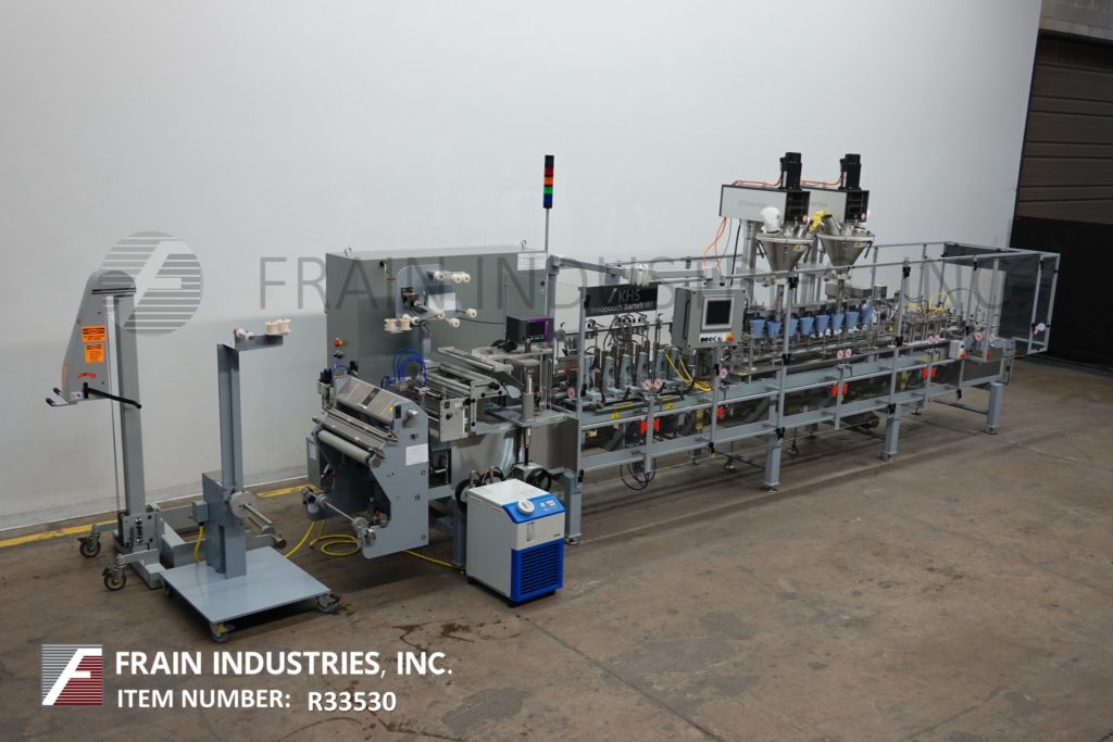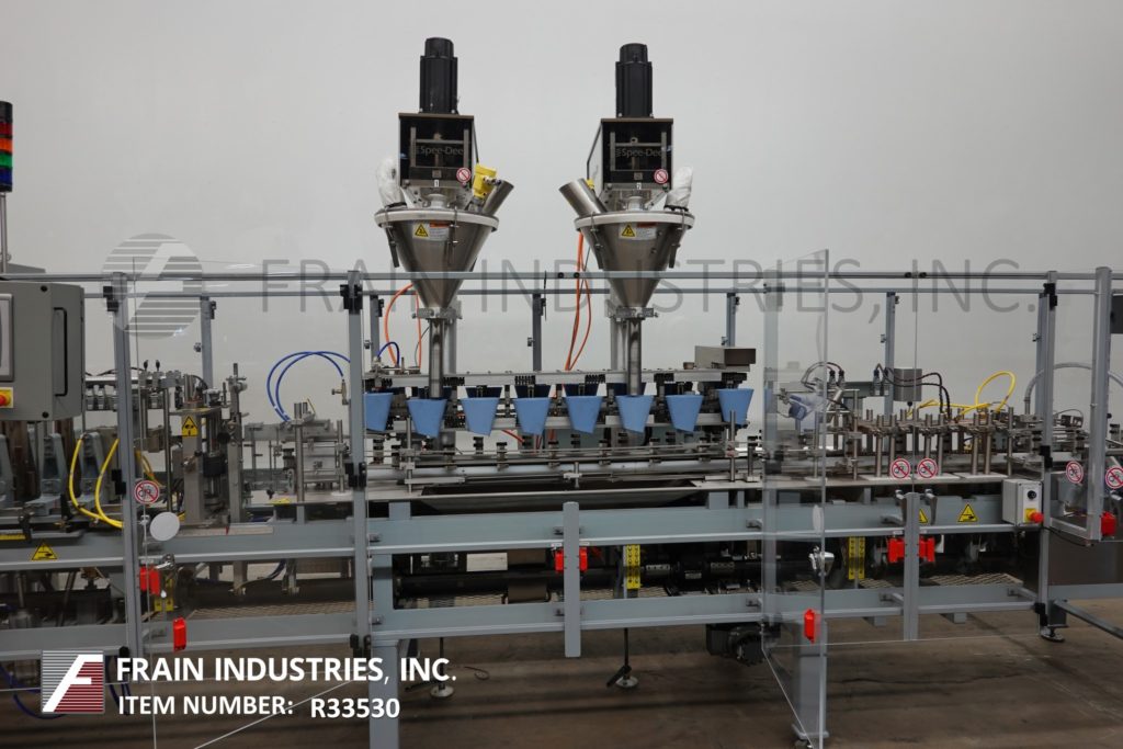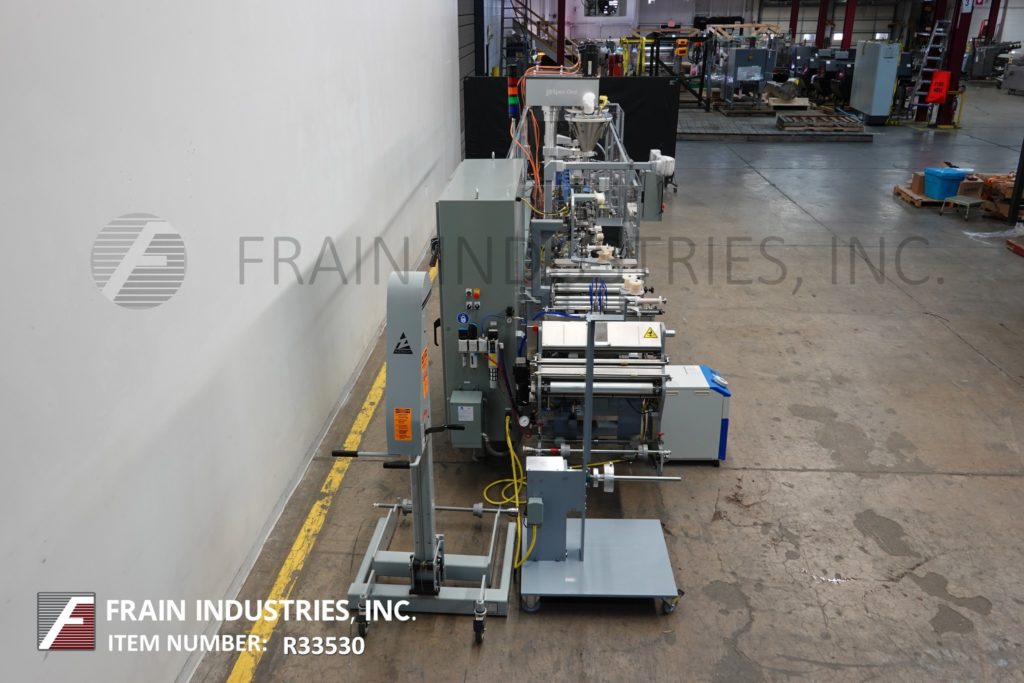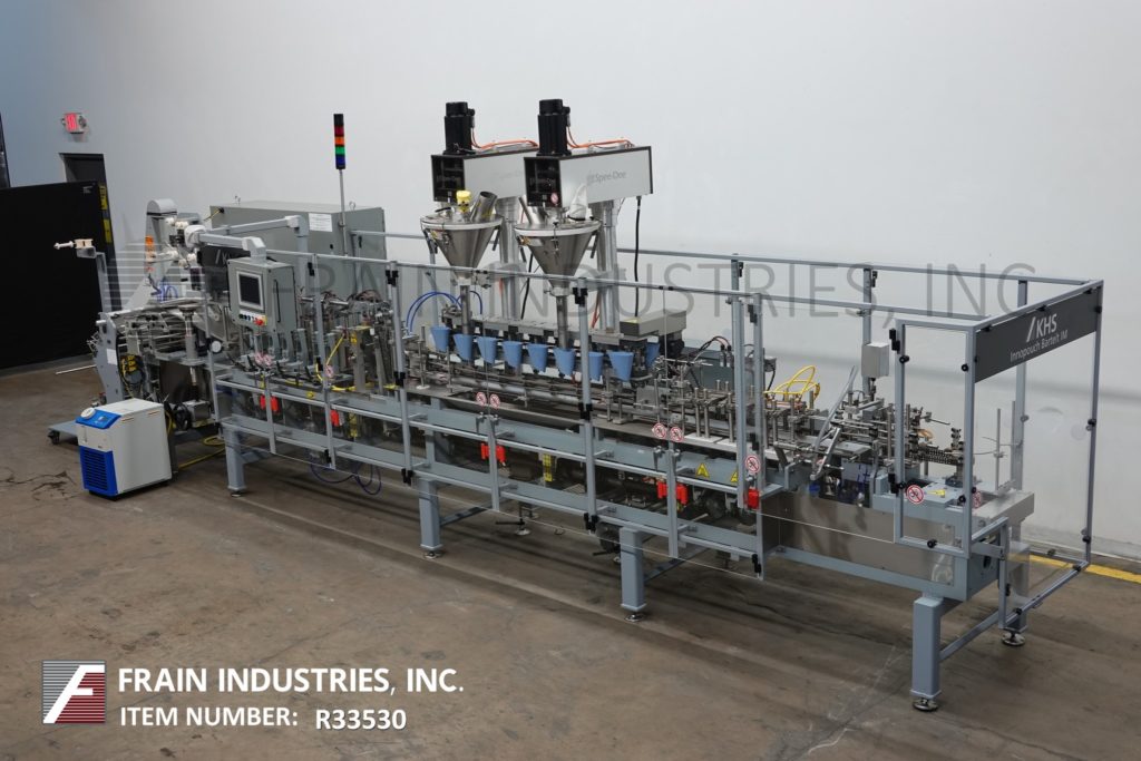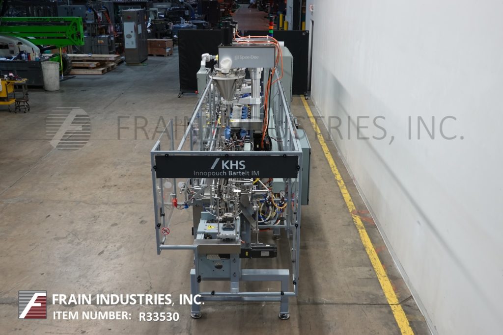 返回所有设备KHS / Bartelt Innopouch, IMF8-16型,Automatic, left to right, horizontal,间歇性运动,servo driven, flexible pouch, form, fill, seal machine额定每分钟20 - 110 pouch -取决于材料和应用。能够做(3)侧密封,开放gusset和鳍袋袋大小范围:2″到7-3/4″在宽度;2″到9-1/2″高度与适当的更换部件。最后做3.5″在宽度到4.25″在高度到0″在深度鳍袋和6.26″在宽度到7.25″在高度到2.5″在深度扣袋。配备链式喂袋输送机,在8个″中心设有(16)夹袋站,端卷料喂膜辊规格为24″最大外径,21″最大卷筒宽度3个″外径。(16)旋转灌装漏斗站设置在8个″中心,与(2)Spee Dee型号3600S伺服驱动螺旋填料与产品沉降器,顶部袋清洁器,预热与顶部热密封和冷却袋站与真空吸盘放电。控制面板采用A/B PLC控制和A/B触摸板控制器,具有驱动/速度,启动/停止,jog, reset和e-stop控制,配有真空泵,联锁安全门和统计灯条。安装在重型多腿框架。
