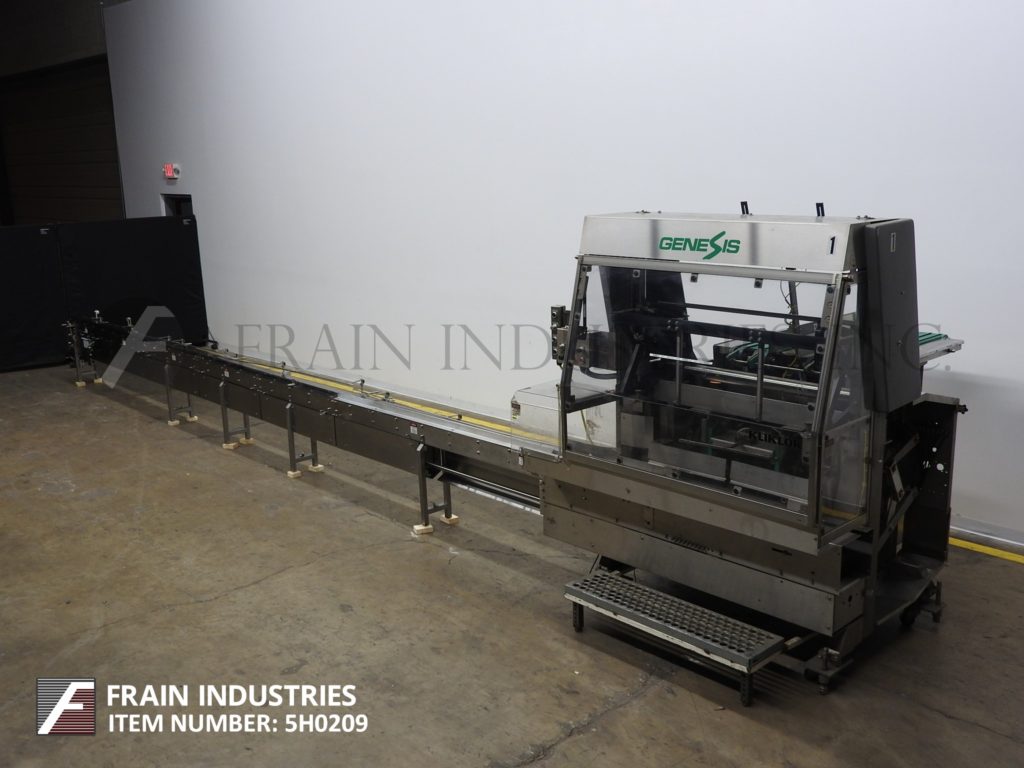 返回所有设备Kliklock型成因GF,自动,不锈钢,双头,托盘前。额定每分钟30到60冲程每个头和托盘的数量-取决于材料和应用。托盘尺寸范围:5"至16¾"长度;4"至10"宽度;深度7/8"至4",适当更换零件。配备双48"长x 11½"宽(4)鹰皮带自动空白托盘杂志,吸盘往复pic n的地方,双头ram与小皮瓣和主要皮瓣折叠犁头,Lexon帽密封区域升降访问门,64"长拖链托盘转移输送机设置在21"中心通过机器和336"长不锈钢托盘转移输送机从机器。控制面板有jog, manual, run, forward, reverse, vacuum feed,每分钟纸箱开关和启动,jog,停止和e-stop按钮控制。安装在重型不锈钢基础框架与脚轮和高度可调腿。