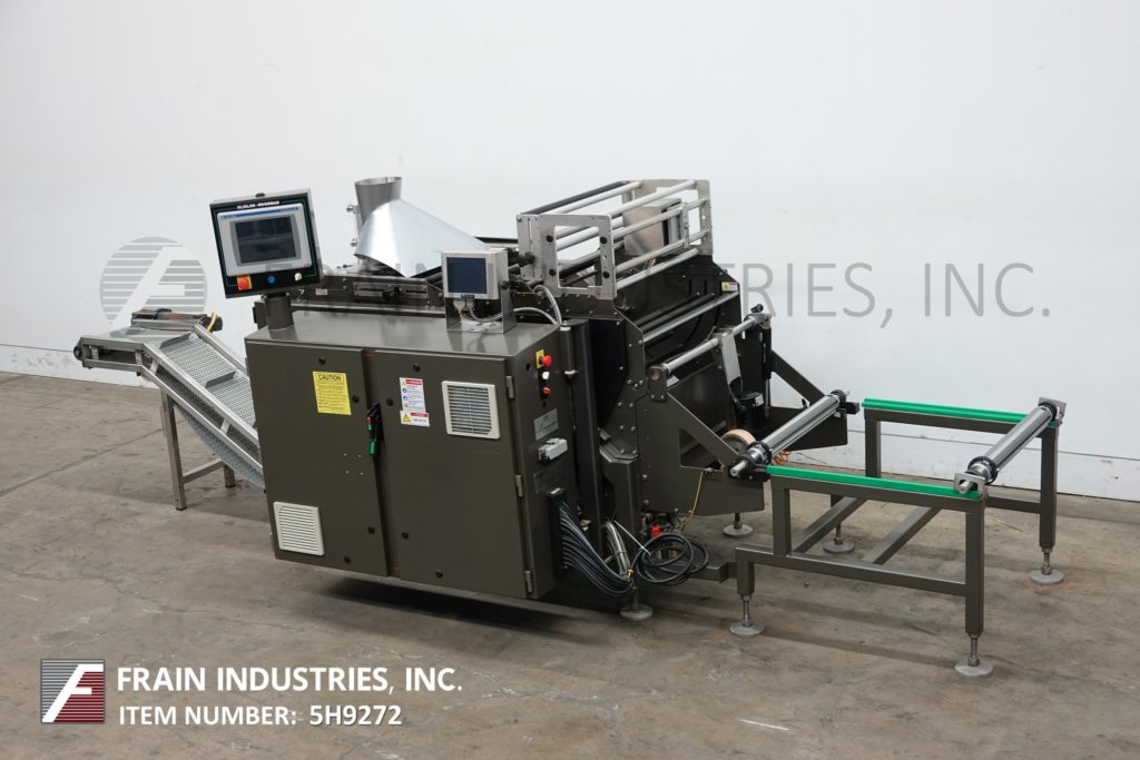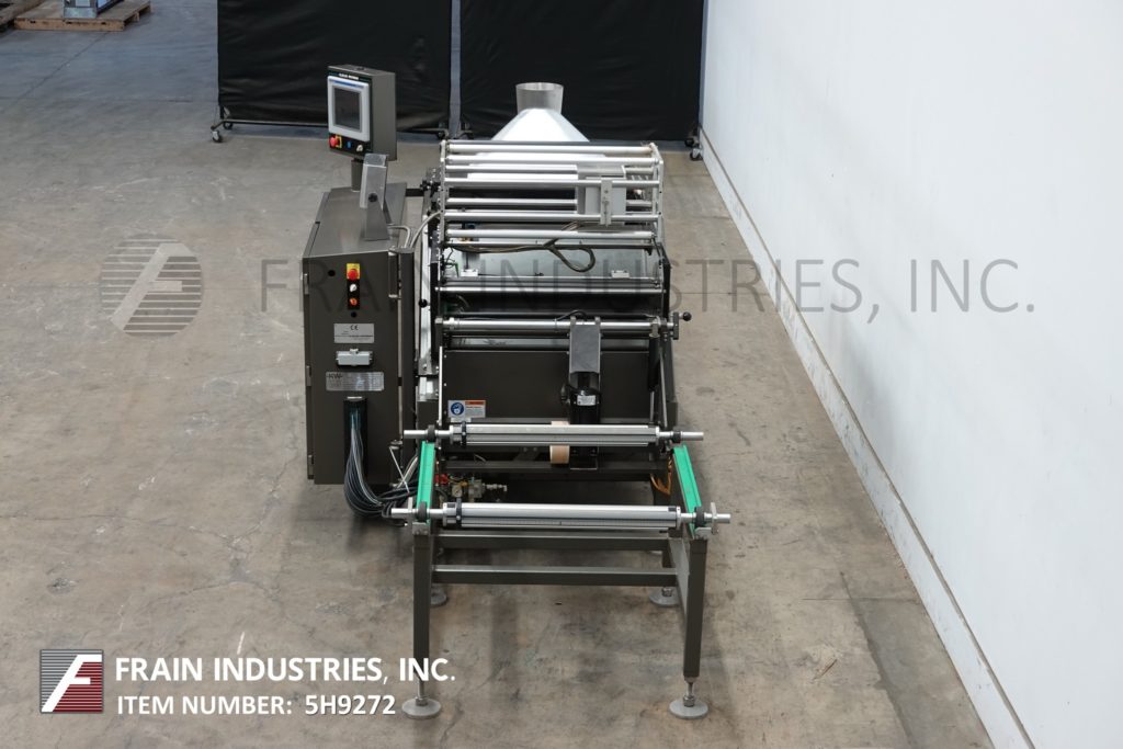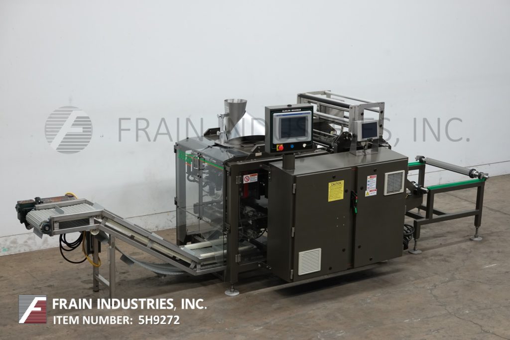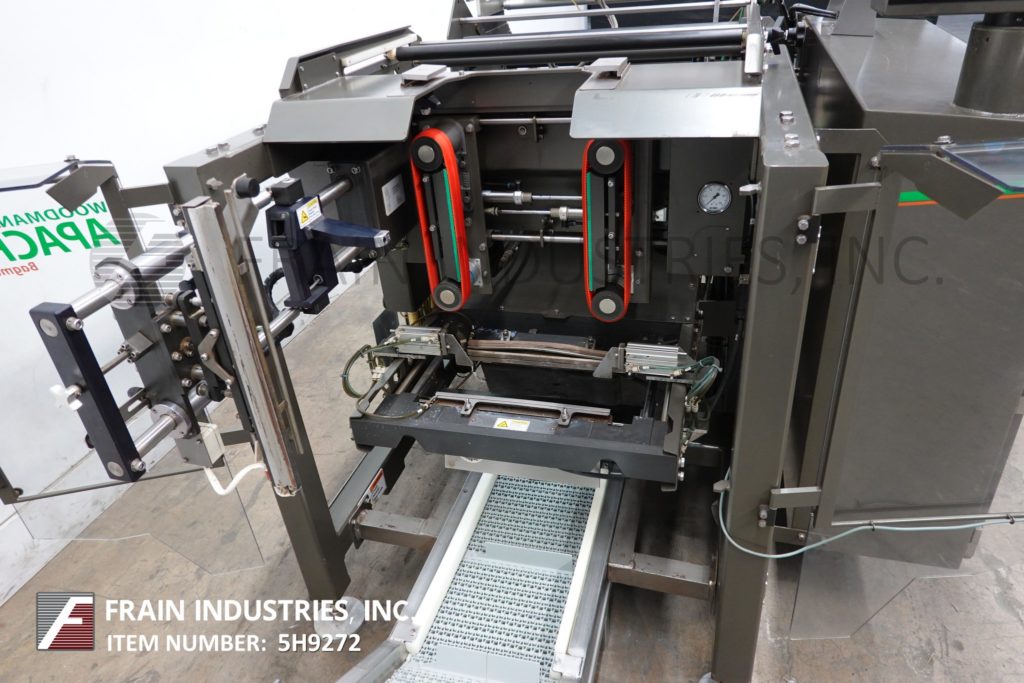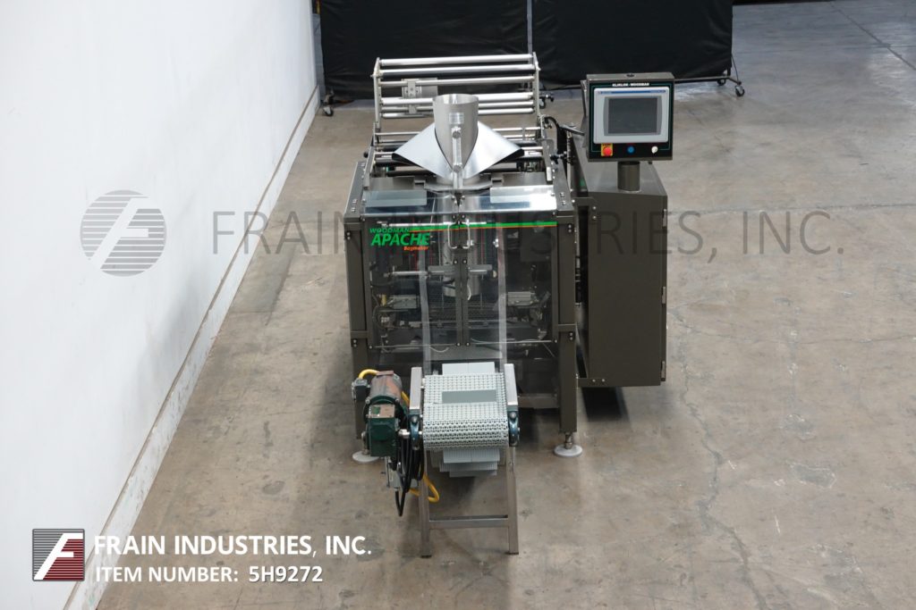 Back to All EquipmentKliklock, Woodman Model APACHE, continuous motion, open design, vertical form, fill, seal machine rated from 10 to 120 bags per minute – depending on materials, application and machine configuration. Stainless steel contact parts. Bag size range: 3" to 22" long x 2.50" to 13.75" wide. Bag Types: pillow pouch, gusseted and flat bottom (with proper change parts). Equipped with 8" forming tube, 12" long x 1-1/2" wide dual side belt film assist, 16" wide x 1-1/2" thick hot impulse seal jaws with 20" long lap seal bar, film rolls 25" long with 3" ID core and has a maximum roll weight of 300lbs, powered film unwind, film regitration and product discharge incline cleated conveyor. Control panel has A/B controller with A/B HMI color graphic touch screen panelview controls and machine stop, run, alarm only with stop switches and e-stop push button with A/B powerflex vari-speed controller. Mounted on Flex-Mount low profile frame, designed to support volumetric fillers, weighers and auger fillers reducing the need for mezzanines with height adjustable leveling legs and interlock safety door guarding.
