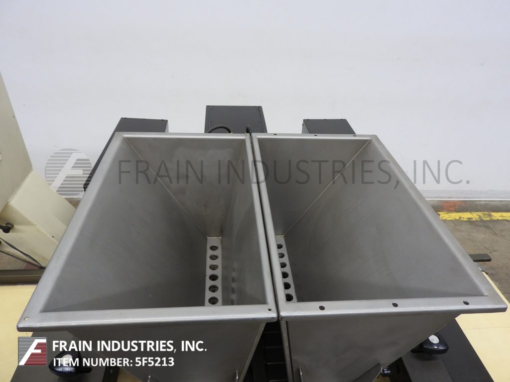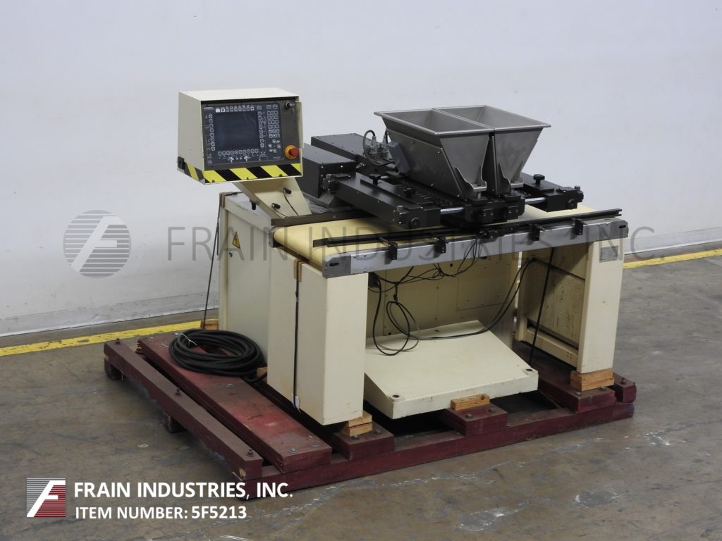 返回所有设备Knobel型号CCM 12/24,每小时50至200公斤,产品数量取决于材料和应用。能够处理8mm, 10mm, 17mm, 25mm, 35mm外径的活塞泵,填充能力为2.56至36.00克,适当的更换部件。配备(2)2ft³不锈钢产品料斗,每侧12个加药气缸和活塞,共24个气缸和活塞。64"长x 18"宽的新优培产品输送机可调节导轨。触控板控制器具有读出式操作界面,并安装有可调高度的调平架底座。用途:直接在冷却隧道皮带上自由加工果仁糖,也可在第三方成型生产线上进行加工。并且会在巧克力和饼干中沉积中心物质。