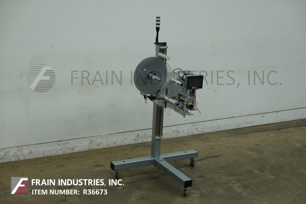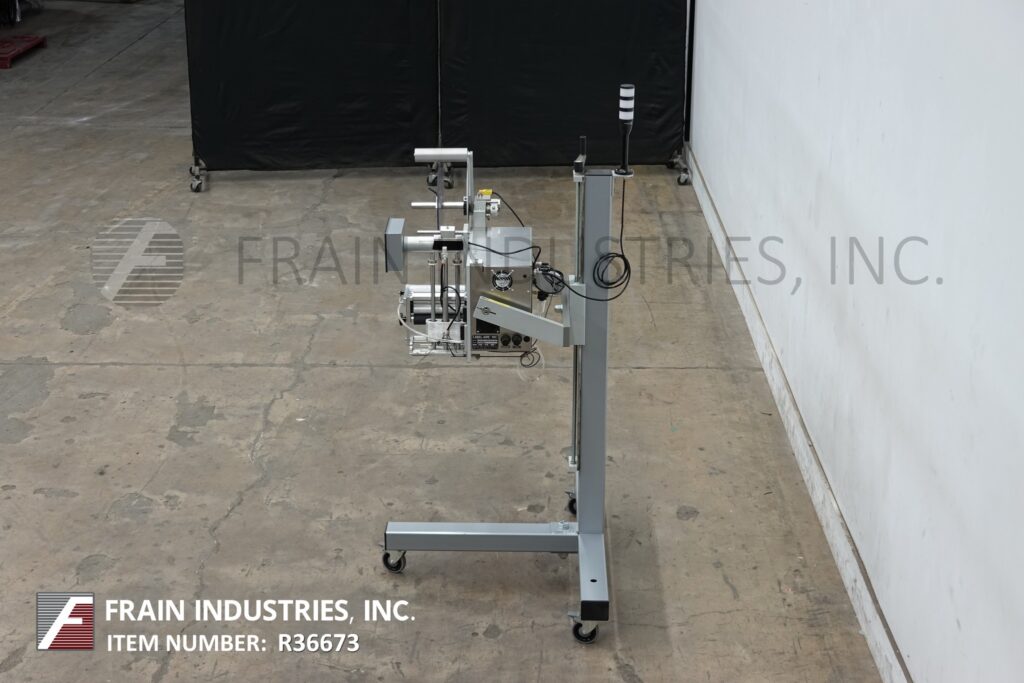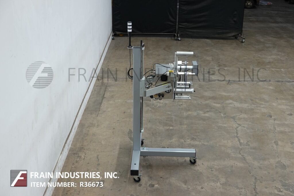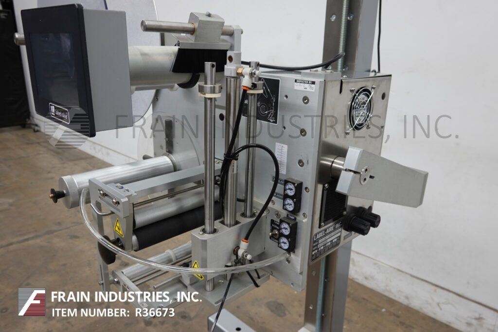 Back to All EquipmentLabel Aire, Model 3114TS-1500 7"x16" RH 1-10"ST LL3L pressure sensitive, blow tamp spot labeler. Rated from 600 to 1,500 linear inches per minute, with number of product – depending on materials and application. Equipped with swivel mounted bracket and blow tamp label head with label size range: ¾" to 5" in Length; ¾" to 7" in Width, with accuracies of +/- 1/32", and has 1" to 10" adjustable stroke with maximum 16" OD label roll with 3" ID cores and has stepper drive. Control with touch screen HMI. Mounted on hand crank height adjustable T-stand with casters.