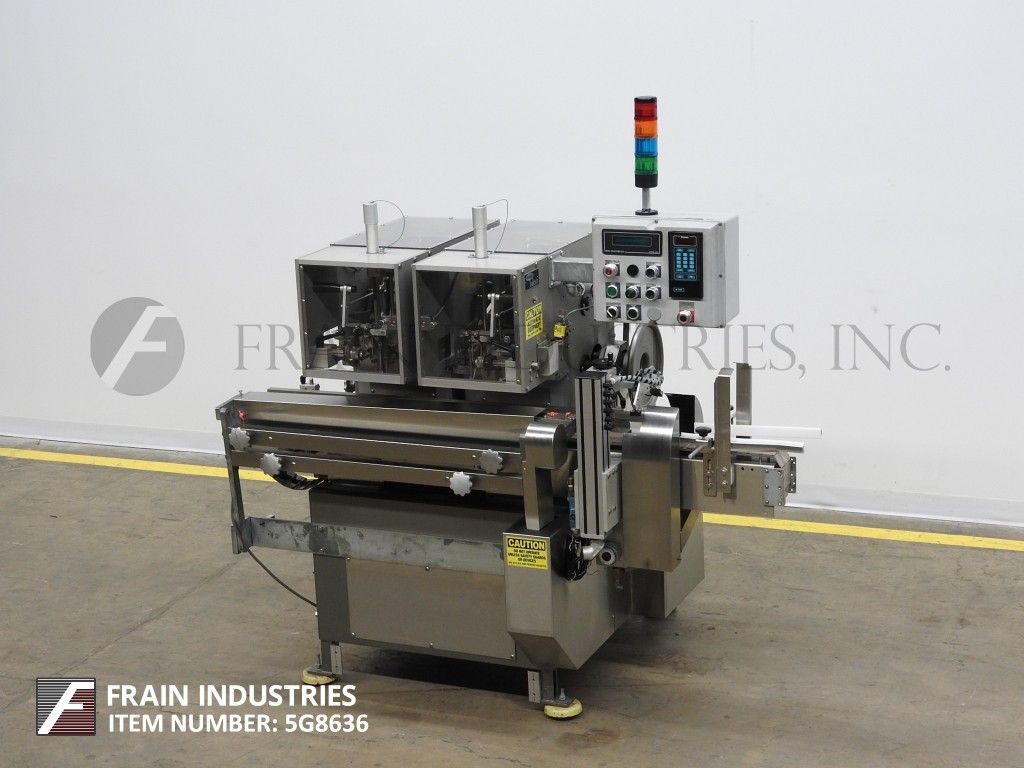 返回所有设备LAKSO 450型,自动,内联,不锈钢,双头,棉花插入。最大棉质重量为每码26克,切断2“至7”的长度。配备了4½英寸宽x 72英寸长的输送机,带有36英寸长的时正时螺钉。按钮可调节的头和高度,棉花饲料检测,瓶装果酱检测和拒绝站。使用AB控制器控制面板,触摸垫控制,启动,停止,停止,,,,e-stop push button controls and status light bar. Rated from 50 to 300 containers per minute – depending materials, application and machine configuration. Capable of one or two insertions per bottle – two insertions reduces speed capabilities. Mounted on stainless steel height adjustable base frame.