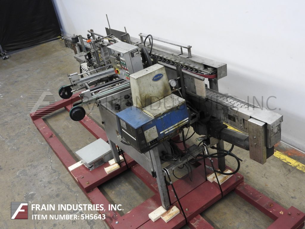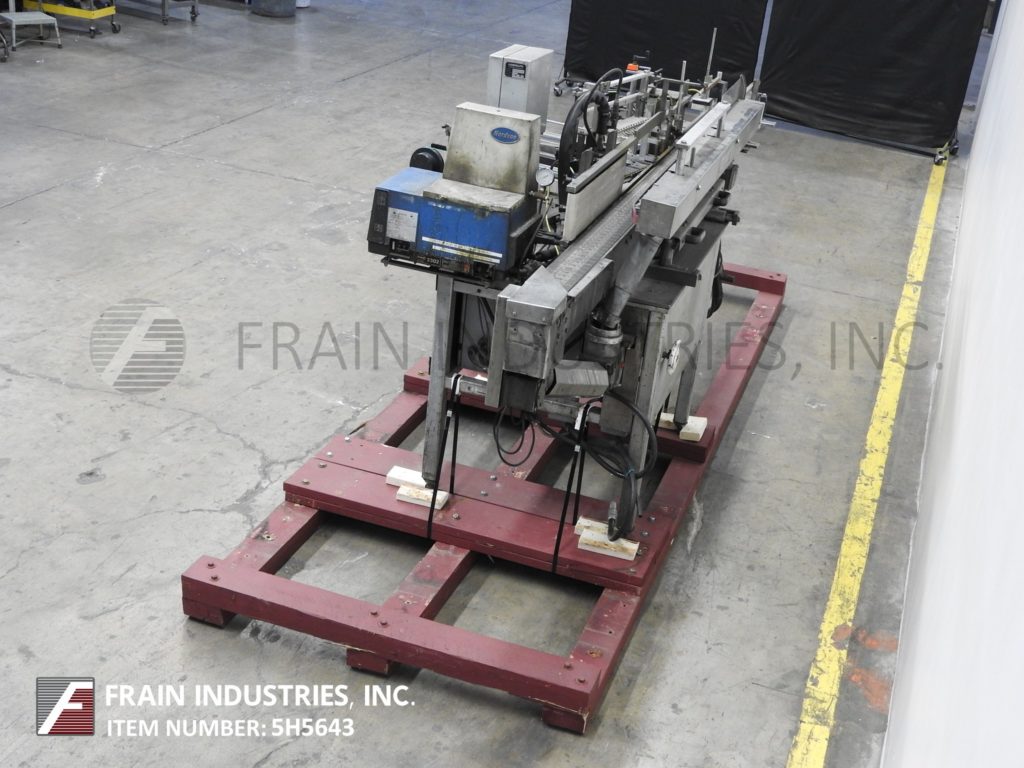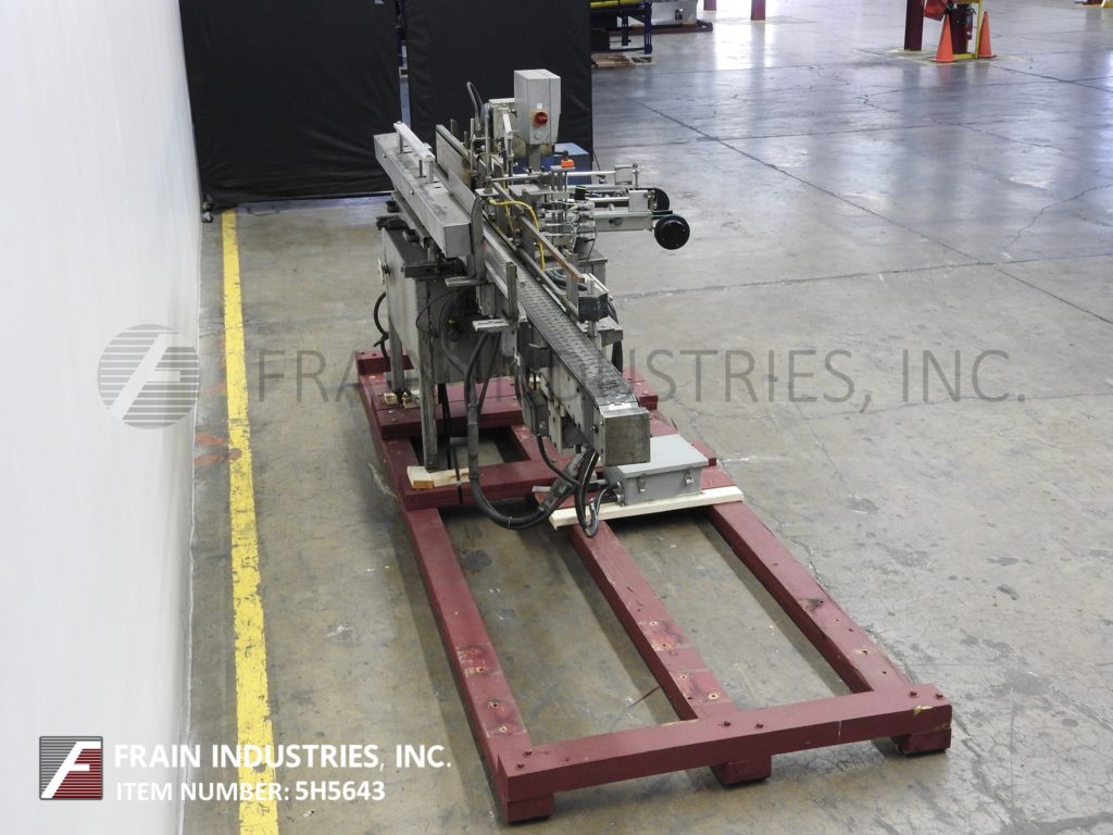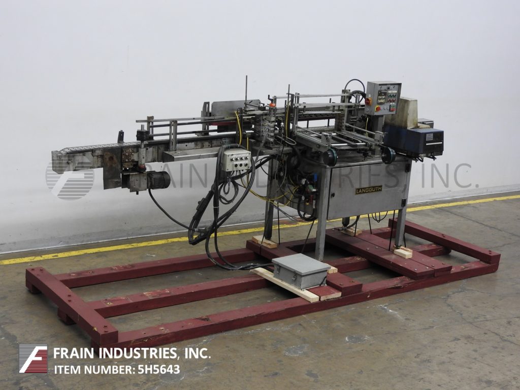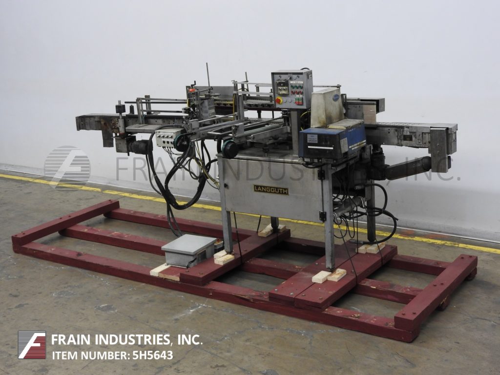 Back to All EquipmentLangguth Model E40, automatic, inline, stainless steel, high speed, full wrap, hot melt glue labeler. Rated from 100 to 600 cylindrical containers per minute – depending on materials and application Container size range: 2¾" to 6" diameter, 2¼" to 9¼" high. Label size range: 8½" to 21¼" long, 1½" to 9¼" high. Rectangular paper or plastic labels. Equipped with 3¼" wide x 164" long delron stainless steel product conveyor with roll through belt, side label magazine and Nordson hot melt glue system. Control panel with on/off controls for helt melt, conveyor and star wheel. Mounted on heavy duty stainless steel frame.