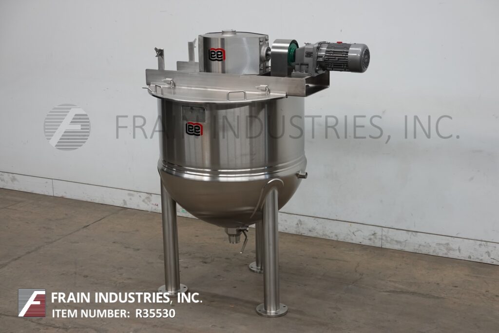 Back to All EquipmentLee, Model 150D9MS 150 gallon capacity, 316 stainless steel, jacketed double motion kettle. Vessel dimensions: 42" diameter x 39" deep with 20" straight wall. Equipped with lift up covers, 3 Hp bridge mounted scrape agitator, flush mounted sensor and 3½" OD / 3" ID Tri-Clamp style bottom discharge with ball valve and 16" ground clearance. Mounted on (3) leg frame.