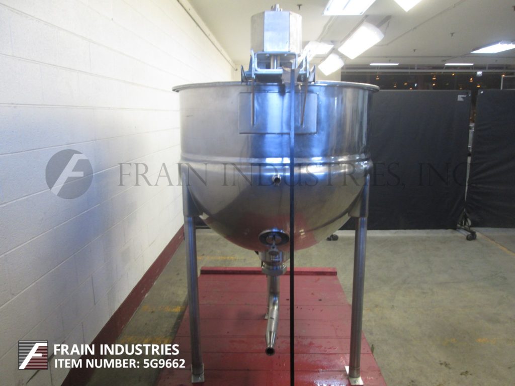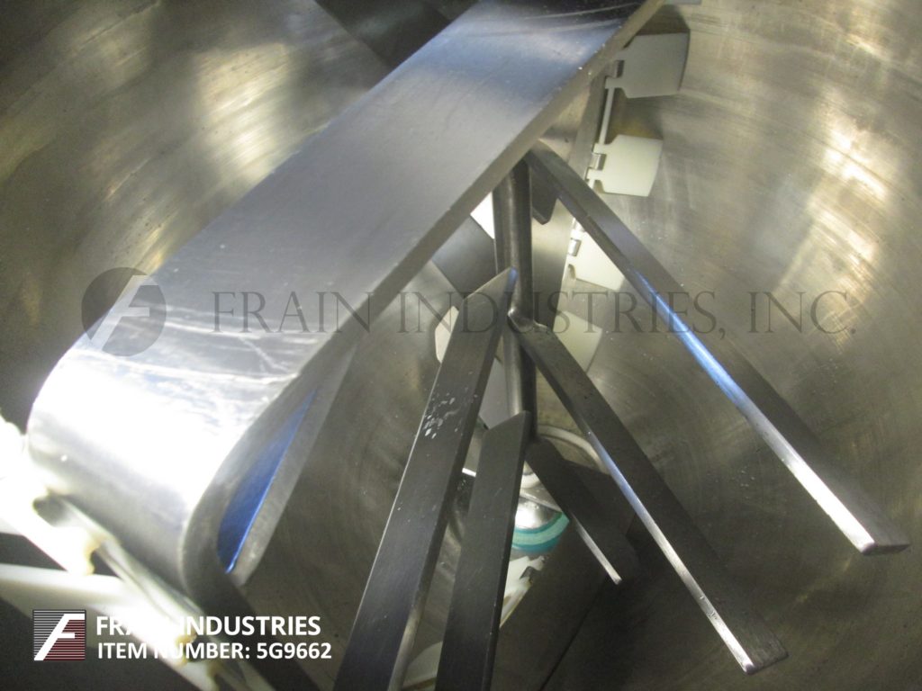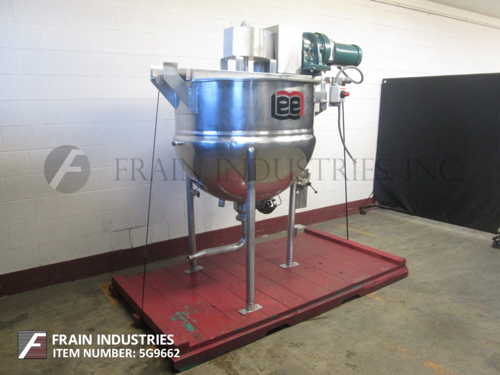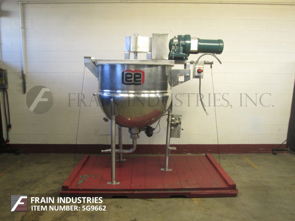 返回所有设备李,150加仑容量,316不锈钢,夹套双动水壶。容器尺寸:42"直径x 35"深,15"直壁。配备升降盖,5马力桥式刮板搅拌器,冲洗式压力传感器和2”外径/ 1¼”ID三夹式底部排放,气动球阀,90°弯头和10”地间隙。