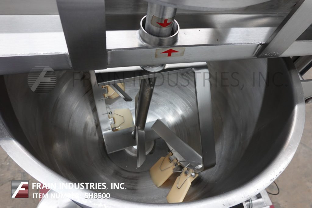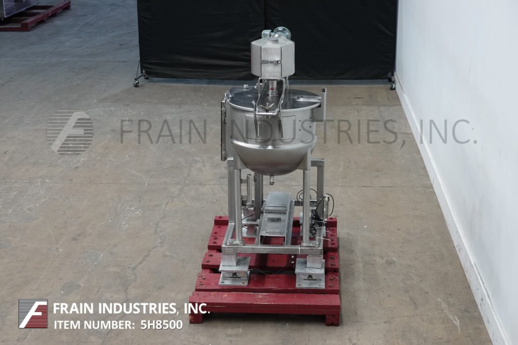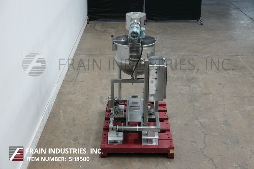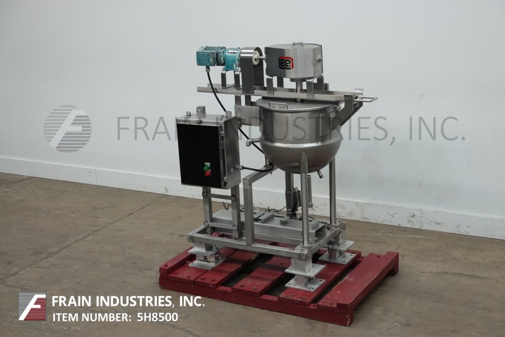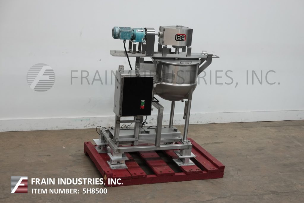 返回所有设备Lee, 25D9MT型号,25加仑,304不锈钢夹套釜,每小时的产品量——取决于材料和应用。容器尺寸:23"直径x 20"深,10"直壁。配备倾斜出桥式刮泥搅拌器,由单¾马力电机驱动和2½“OD / 2”ID三钳放电,与机架间隙为16”。控制面板设有启动、停止按钮。