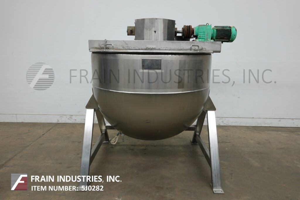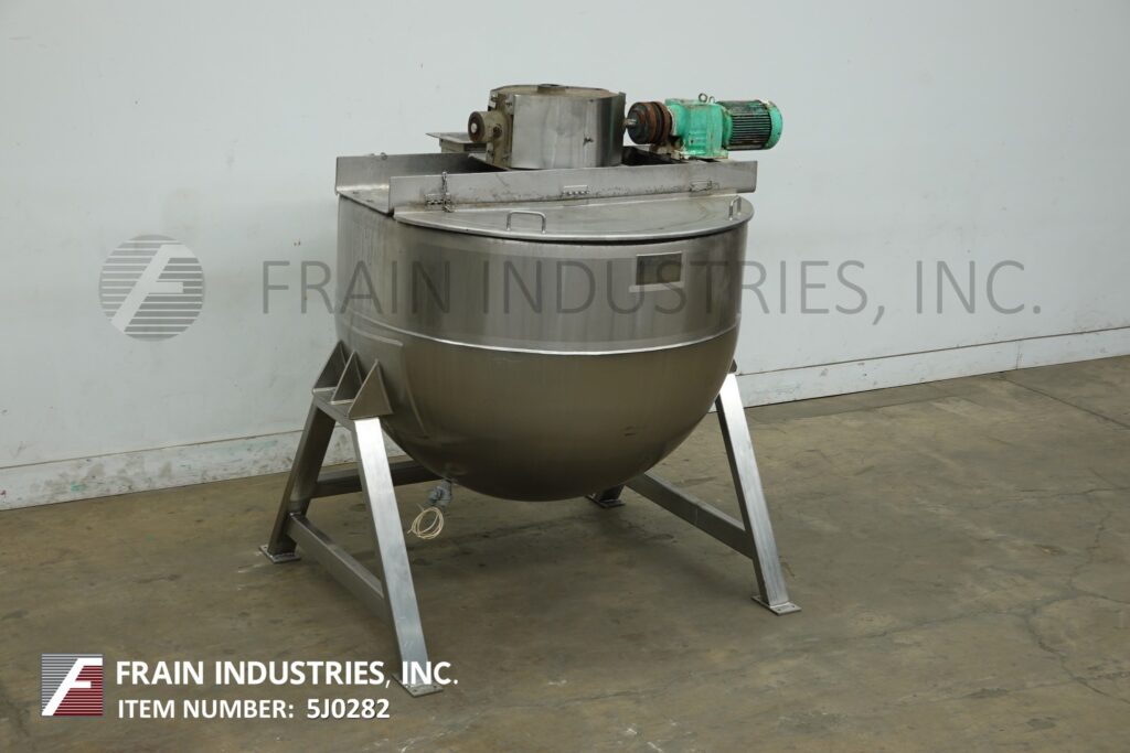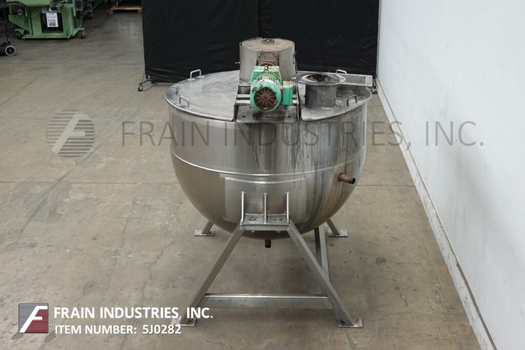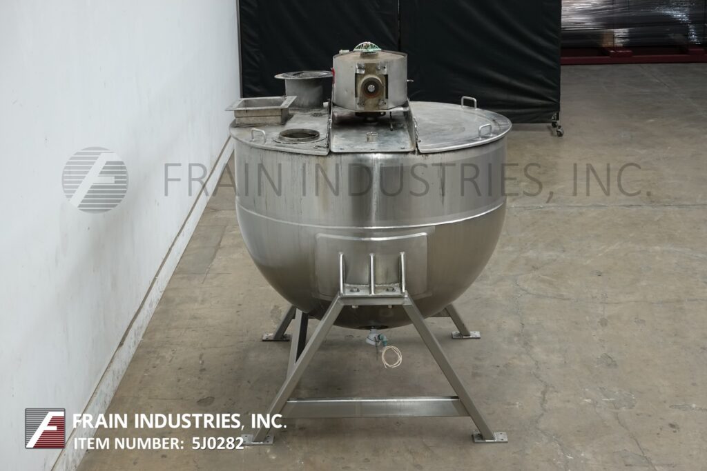 Back to All EquipmentLee, Model 300D9MS, 300 gallon capacity, 316 stainless steel, jacketed double motion kettle. Vessel dimensions: 54" diameter x 40" deep with 20" straight wall. Equipped with lift up covers, 3 Hp bridge mounted sweep agitator and 4½" OD / 4" ID Tri-Clamp style bottom discharge with 17" ground clearance.