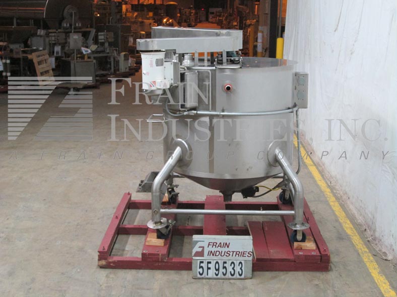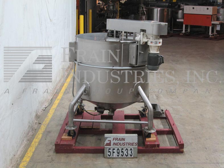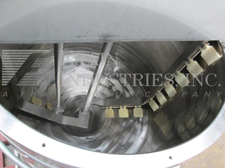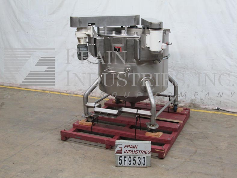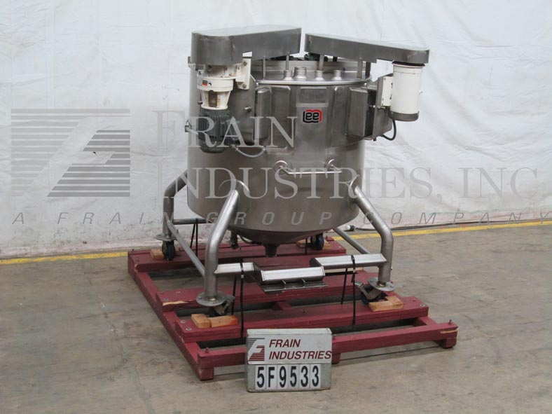 返回所有设备Lee Model 300U10S,300加仑,304不锈钢,蒸汽夹套,双搅拌高剪切搅拌水壶。壶。45“id x 48”深搅拌碗。平顶有桥式安装2 HP锚刮表面和7.5 HP高速锯齿搅拌。全蒸汽夹克额定MAWP为150PSI @ 366°D和MDMT的-20°F @ 150psi与(2)2“OD螺纹夹套入口/出口。锥形底部有5英寸OD卫浴中心底部放电,自动球池底部放电,和9“落地间隙,安装在(4)带脚轮的不锈钢腿上。