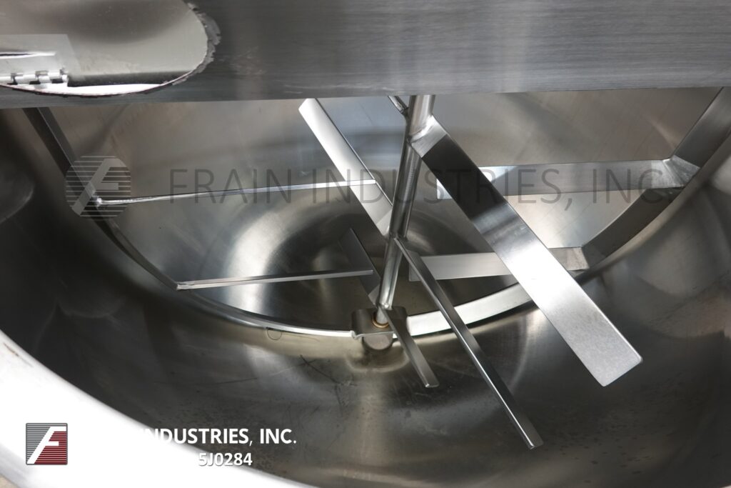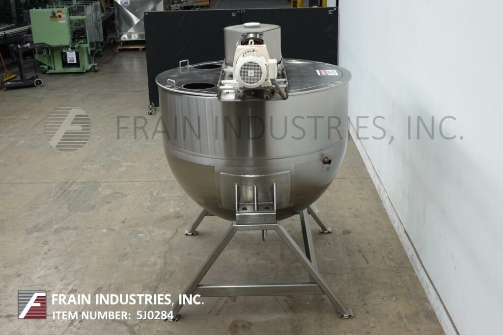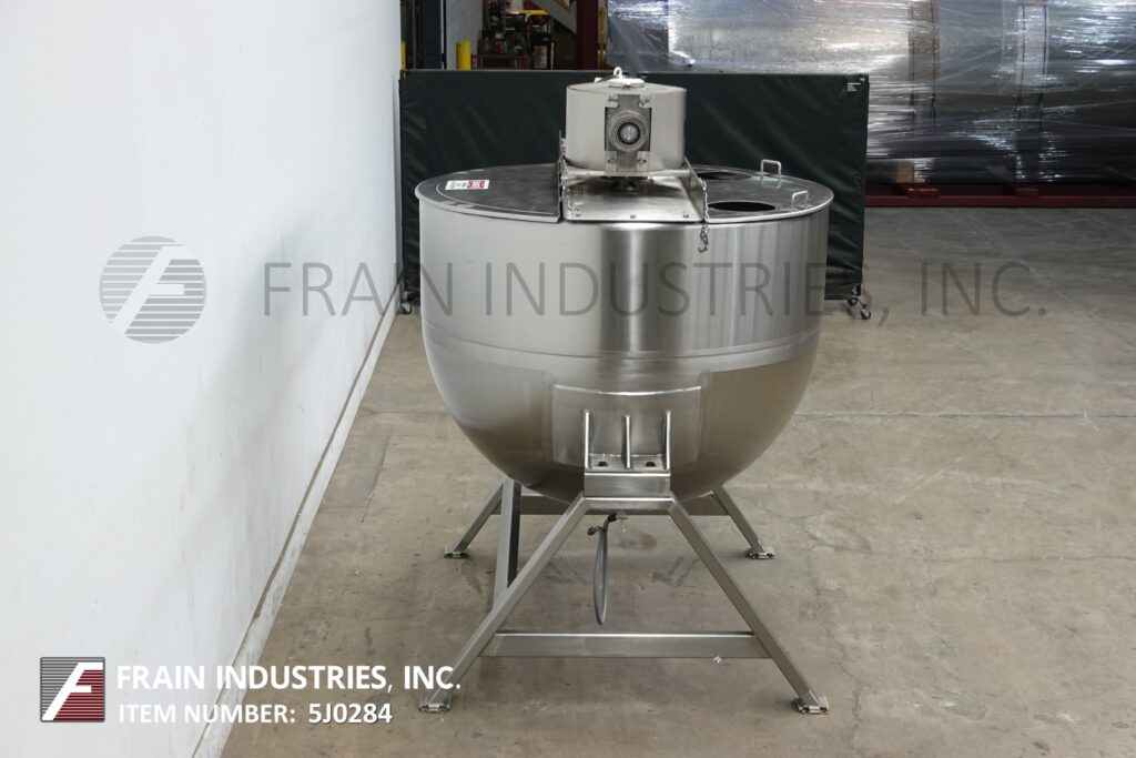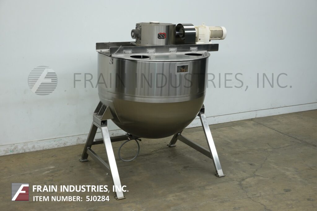 Back to All EquipmentLee, Model 500D9MS, 500 gallon capacity, 316 stainless steel, jacketed double motion kettle. Vessel dimensions: 62" diameter x 48" deep with 24" straight wall. Equipped with lift up covers, 7½ Hp bridge mounted sweep agitator, flush mounted sensor and 4½" OD / 4" ID Tri-Clamp style bottom discharge with 23" ground clearance.