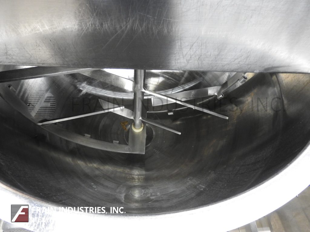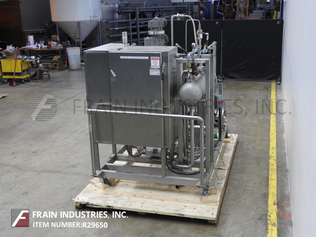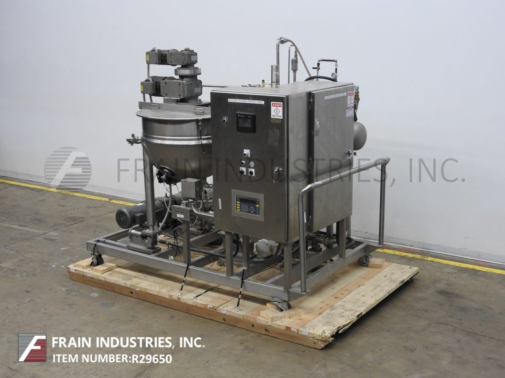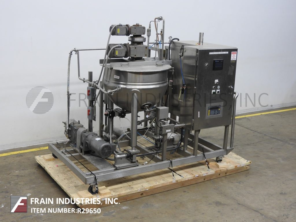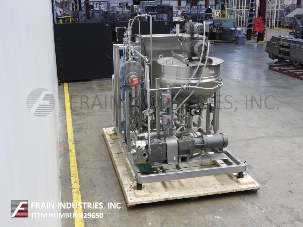 Back to All EquipmentLee, Model 80EDA, platform mounted 80 gallon stainless steel batch mixing system. Kettle Dimensions: 36" diameter x 24" deep. Equipped with bridge mounted double motion scrape surface agitation and mounted on Weigh Tronix load cells. Kettle discharges to a Waukesha, Model 45, positive displacement pump with a jacketed head and 3¼"OD / 1¾"ID I-Line style fitting with 16" ground clearance. Heat transfer surfaces supplied by a self contained 18000w Watlow heating system with hot water tank and Waukesha, Model C, centrifugal pump. Control panel with AB PanelView 550 HMI and AB PLC. System mounted on heavy duty stainless steel push cart.