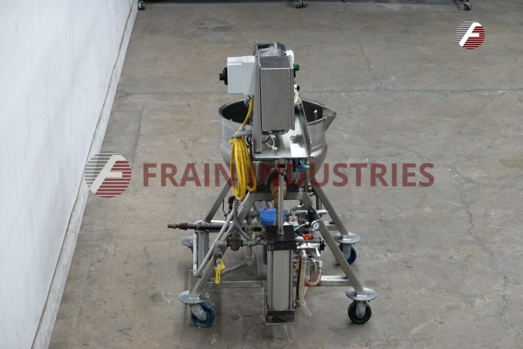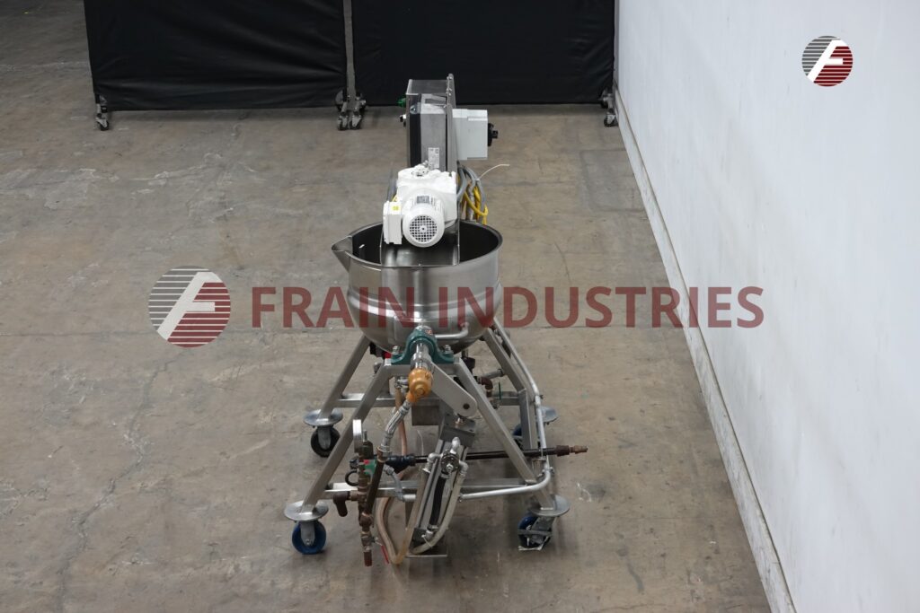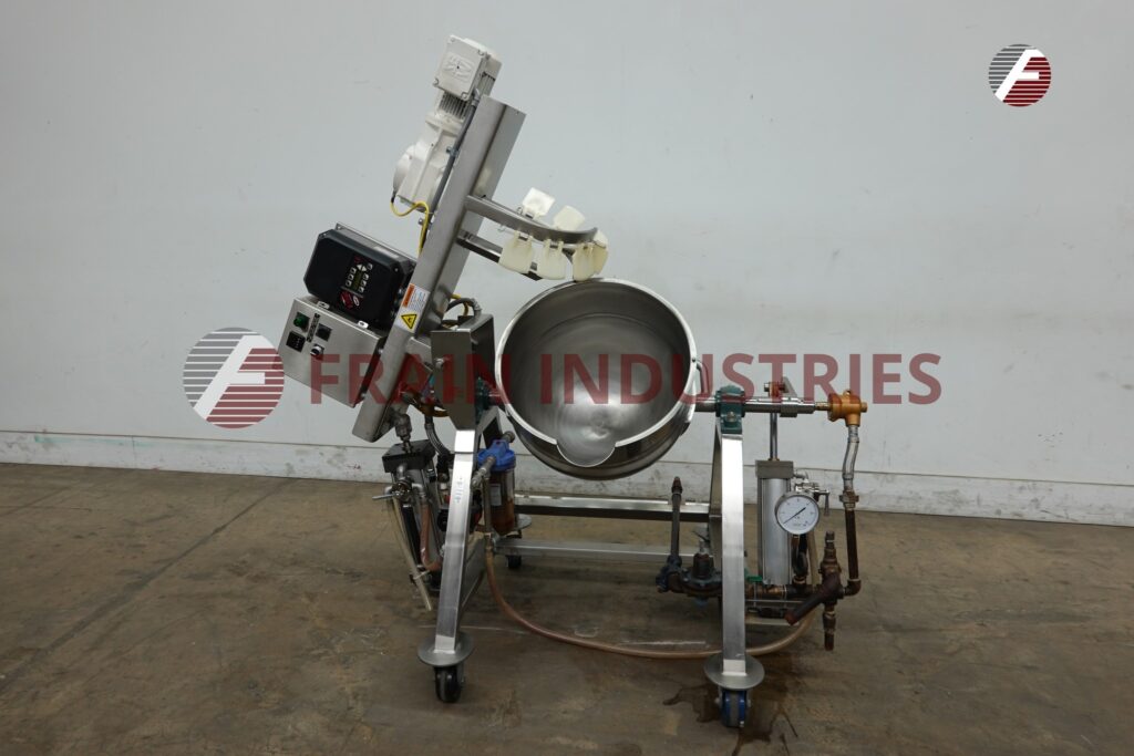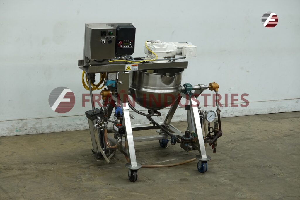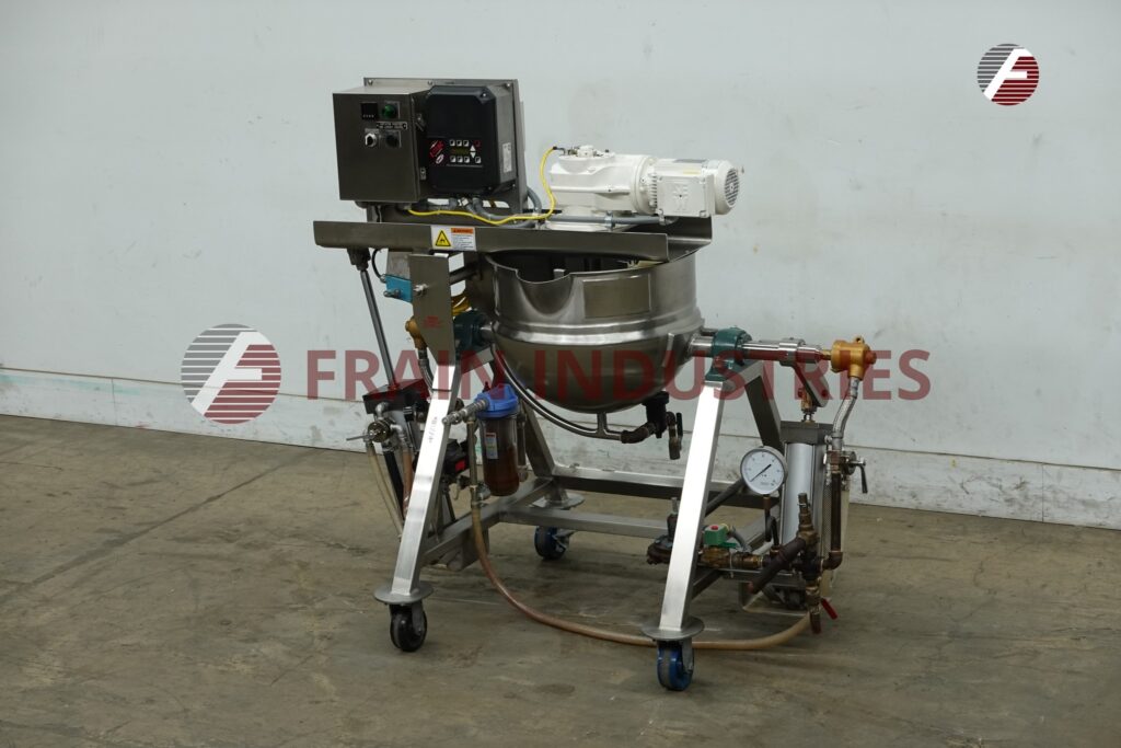 回到所有设备李,20加仑,316不锈钢夹套水壶。容器尺寸:22″直径x 16″深与6″直壁。配备倾斜出桥安装,刮搅拌器由1马力驱动变速控制和倾斜放电与20″离地间隙。安装在不锈钢框架上,手动水壶倾斜排出。