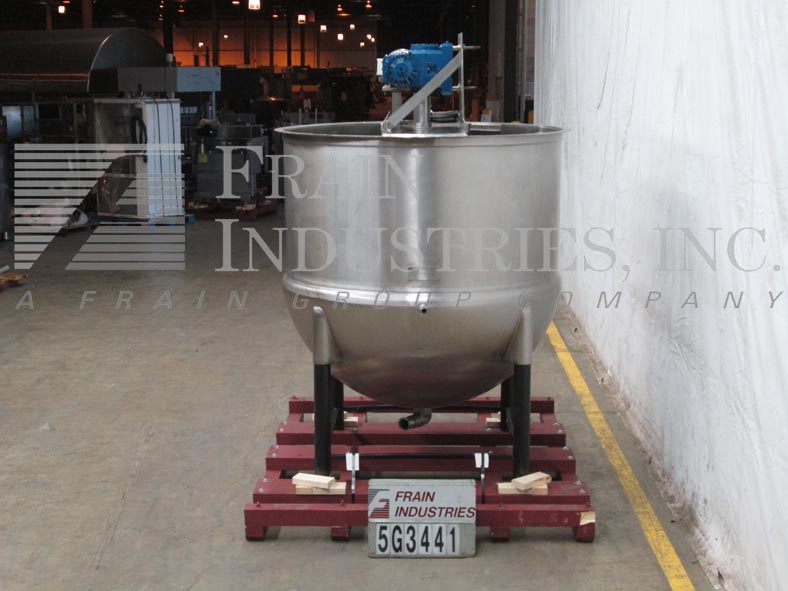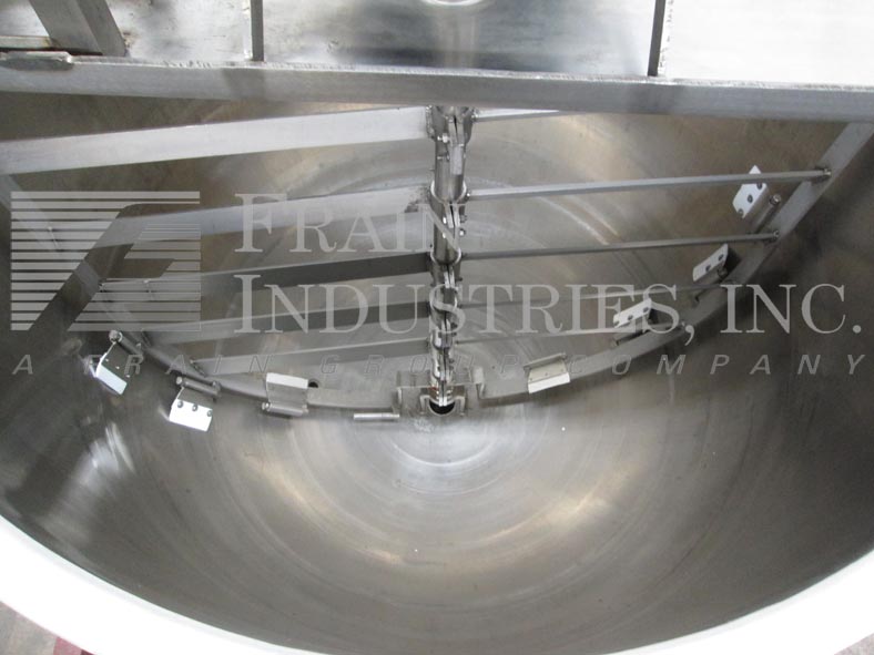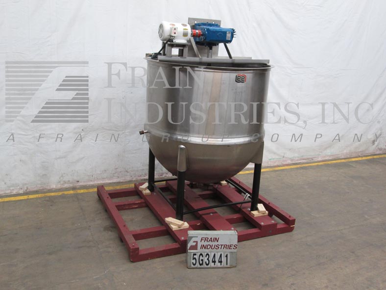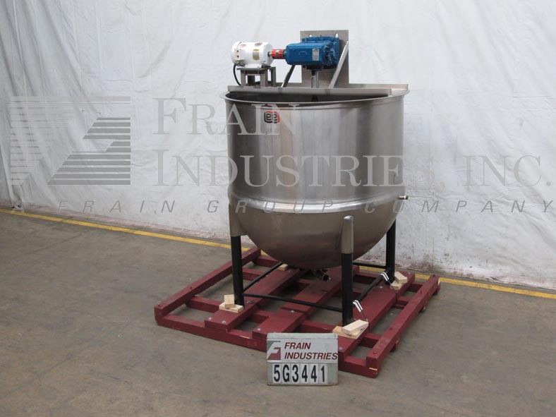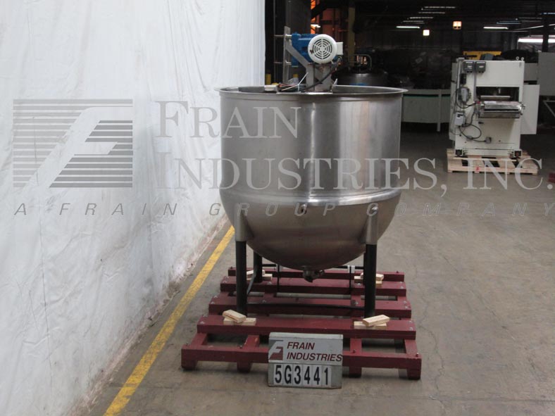 返回所有设备李600加仑不锈钢夹套水壶。容器尺寸:直径60";在深度60”。护套:40 psi, 300°F。配备桥式刮刮搅拌和3“中心底部放电7.5”离地间隙。安装在四个髋臼腿。