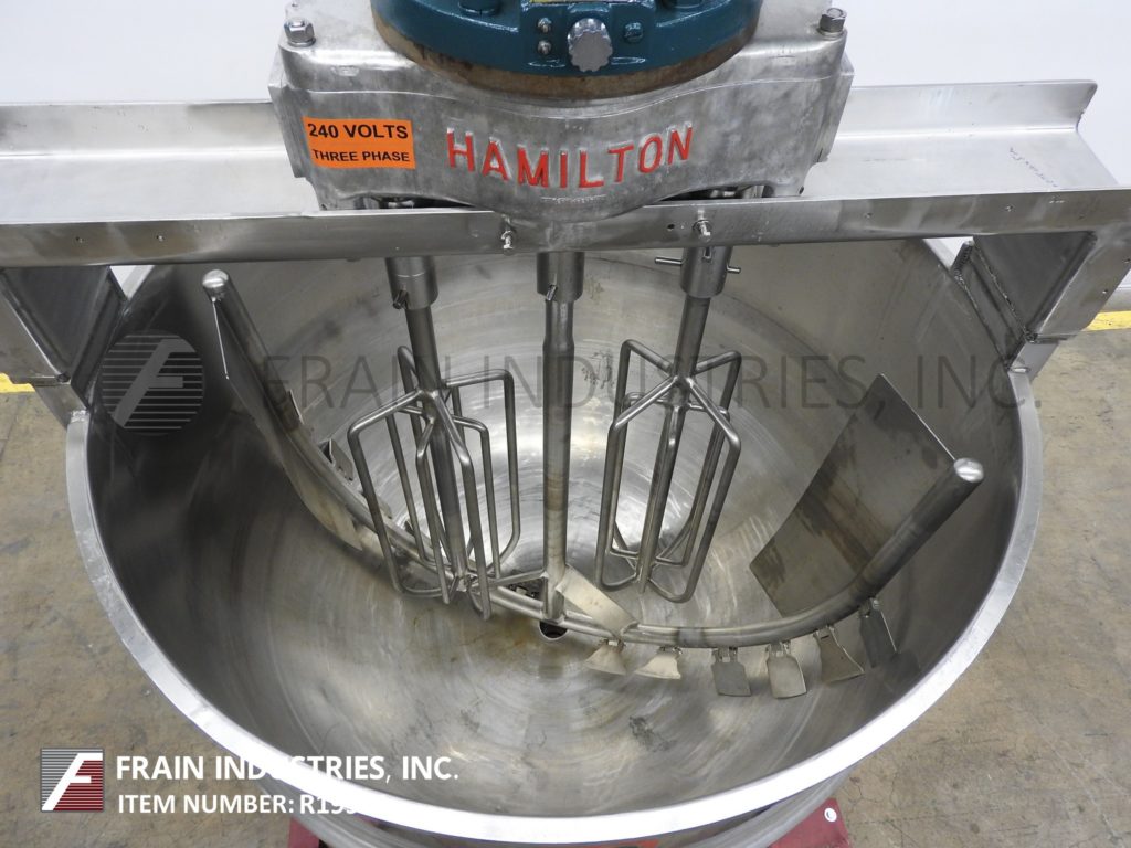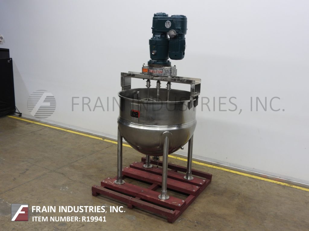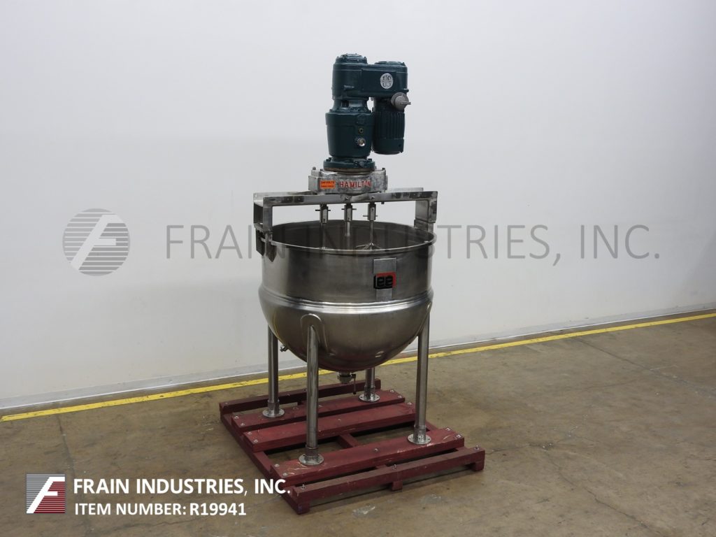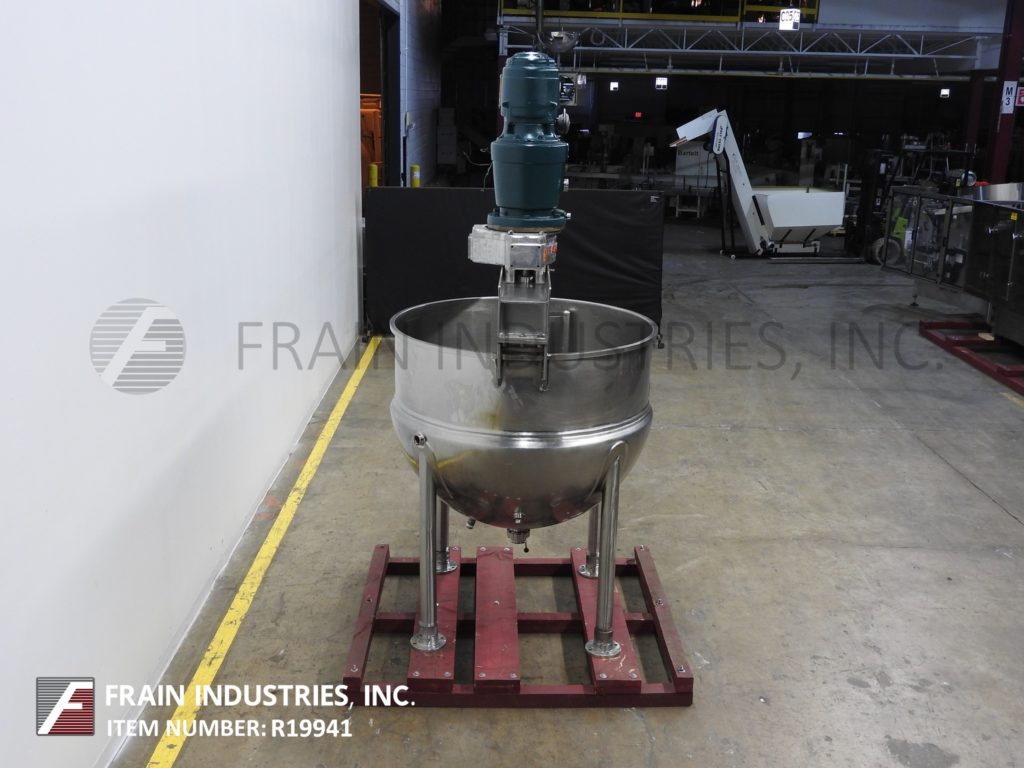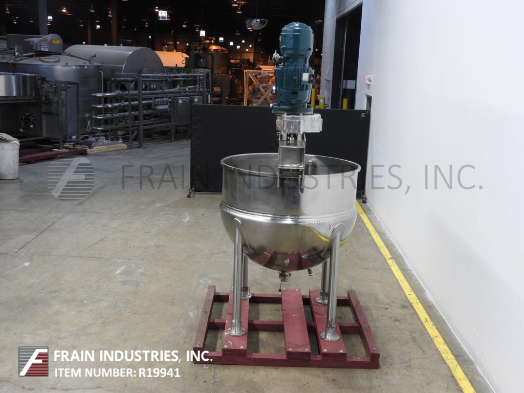 返回所有设备Lee,300加仑容量,316不锈钢,夹套三重运动水壶。船舶尺寸:54“直径x 42”深,配有16英寸的直墙。配备5个HP桥式安装刮板/(2)12“直径X 28”长搅拌器,具有可变速度齿轮箱和3½“OD / 3”IDTri-Clamp风格底部放电,20“接地间隙。