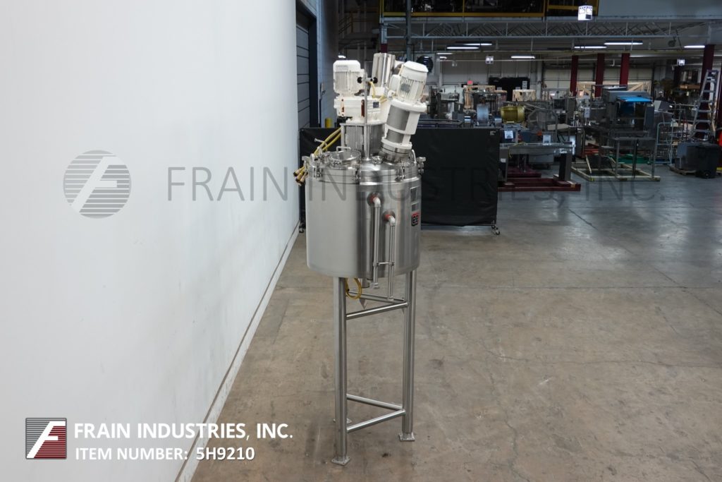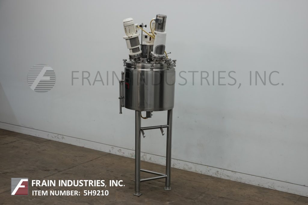 Back to All Equipment李,国防部el 50U75, 50 gallon capacity, 316 stainless steel jacketed and vacuum process tank. Vessel dimensions: 30" diameter x 28" deep with a 16" straight wall and cone bottom. Equipped with a 2 Hp top mounted sweep agitator, 1 HP Prop agitator, 1½ hp high shear agitator and 2½" OD / 2" ID Tri-clamp style bottom discharge with pneumatic plug valve and 55" ground clearance. Mounted on (3) tube legs.