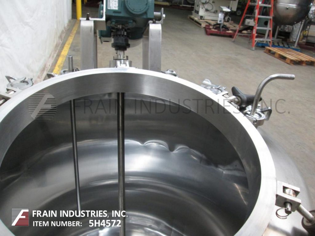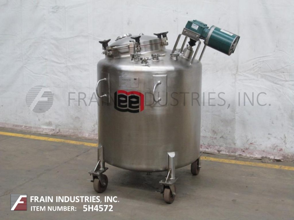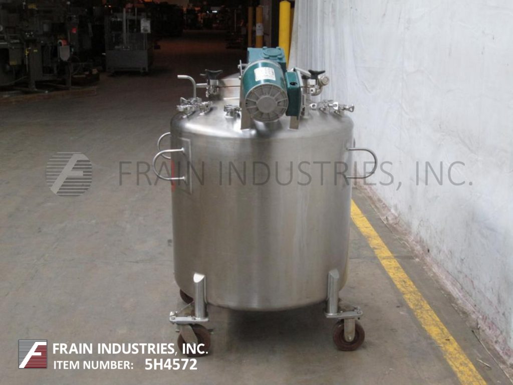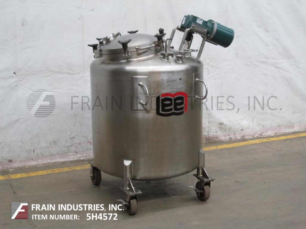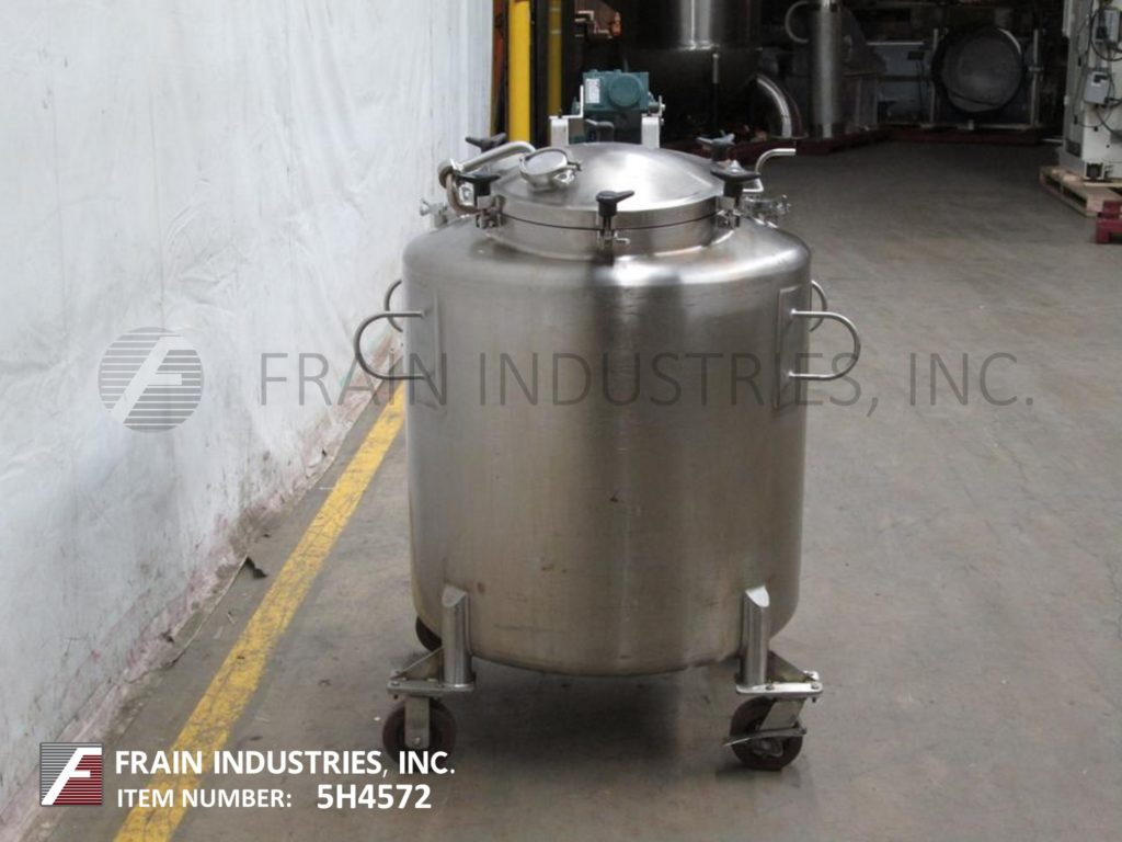 返回所有设备李130加仑(500升)便携式316不锈钢搅拌容器。容器尺寸:34"内径x 30"高直壁,容器压力等级:最大。内部设计FV/35 psi,温度281℉。配备圆顶顶部/碟形底部,18"直径人孔与压紧盖,3"ID三钳端口,(8)1-1/2"ID卫生三钳连接入口端口,倾斜/偏移混合器与4"支柱搅拌,1-1/2"ID中心底部三钳出口,3-1/4"地间隙。水箱安装在(4)重型脚轮上,两个带刹车的旋转脚轮。