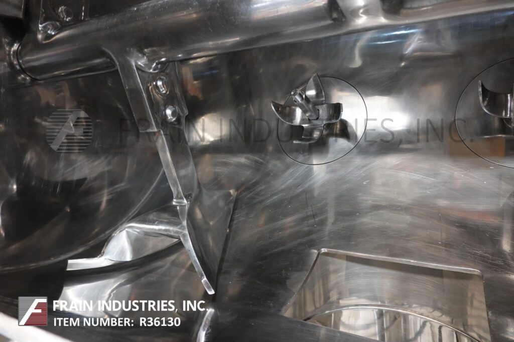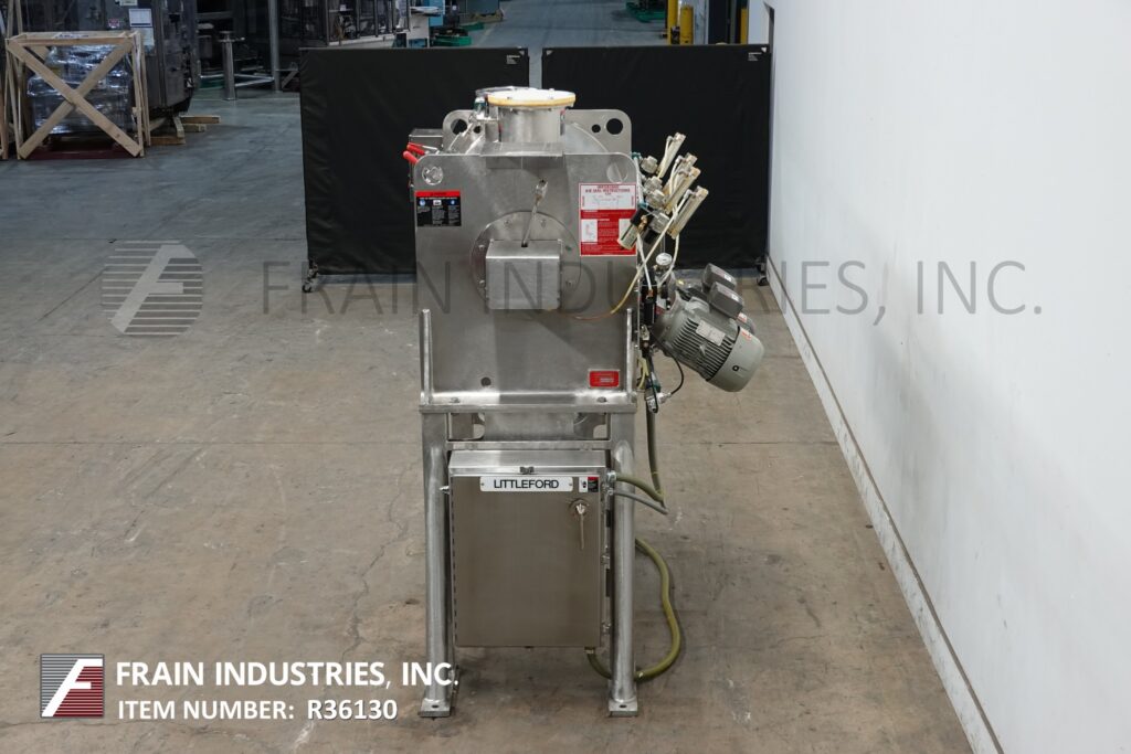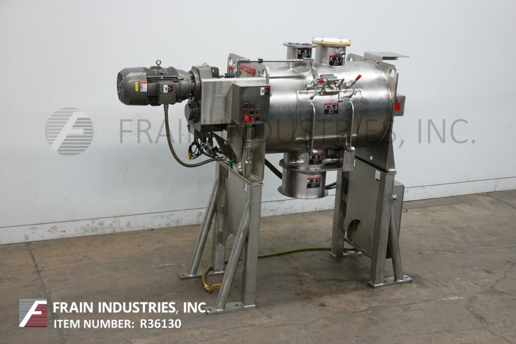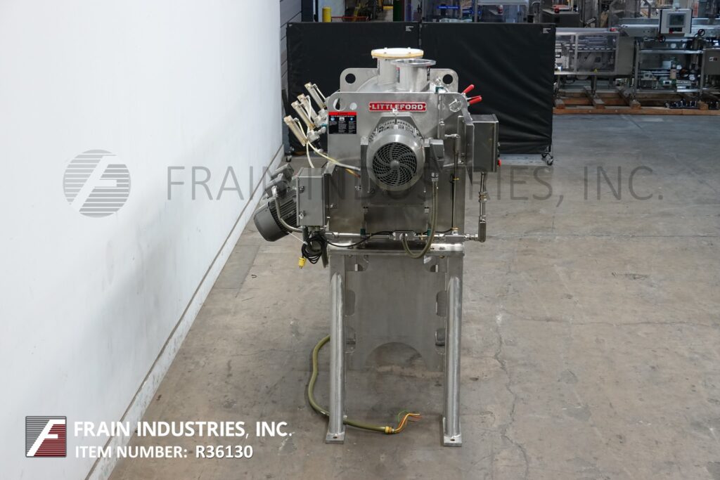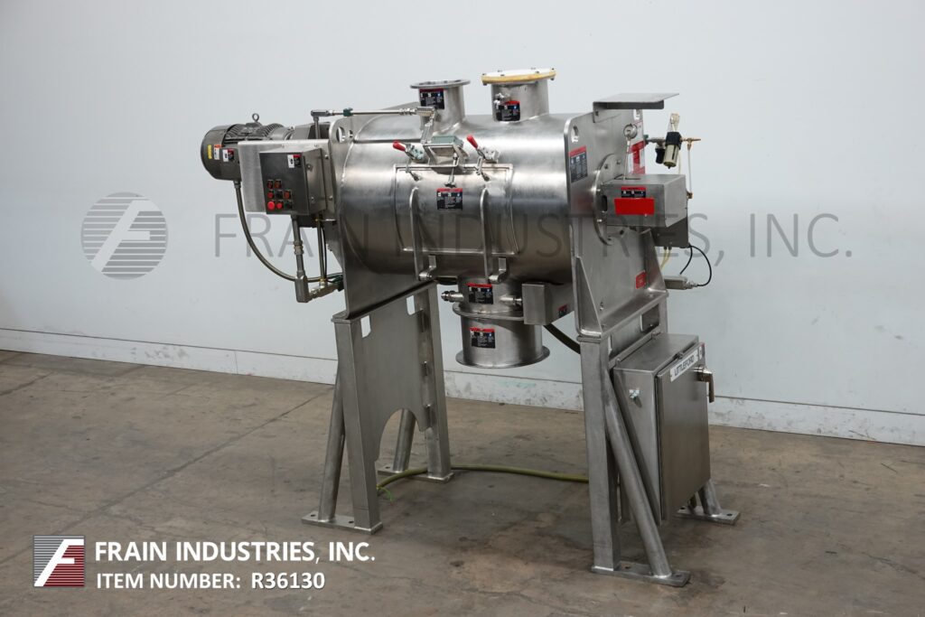返回所有设备利特福德,型号FKM600-D, 600升(21立方英尺)不锈钢犁混合机每小时与磅产品-取决于材料和应用。内室尺寸:32“直径× 48”长度。配备(5)犁由20马力驱动,(2)10马力的切刀,侧室安全联锁检修门,法兰19“外径/ 15½”内径中心底部卸料,气动阀和36“地板间隙。安装在(4)腿不锈钢框架与按钮启动/停止控制。