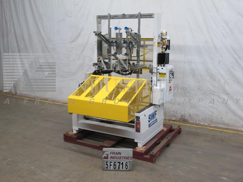 返回所有设备SWF 1T6型,自动,托盘前,热熔胶封口机额定从12至40托盘每分钟-取决于材料和应用。托盘尺寸范围:长度7"至44";宽度为8"至26";长度范围:10-1/ ' 2"至49 / 7/8";宽度12英寸到43英寸。配备了平面空白盘杂志,(8)吸盘真空传感器站,双摩擦轮空白提要,热熔胶系统模式控制器,集成的真空泵,与运行控制面板,慢跑,手动、自动和真空开关启动/紧急停止按钮和变速控制器。