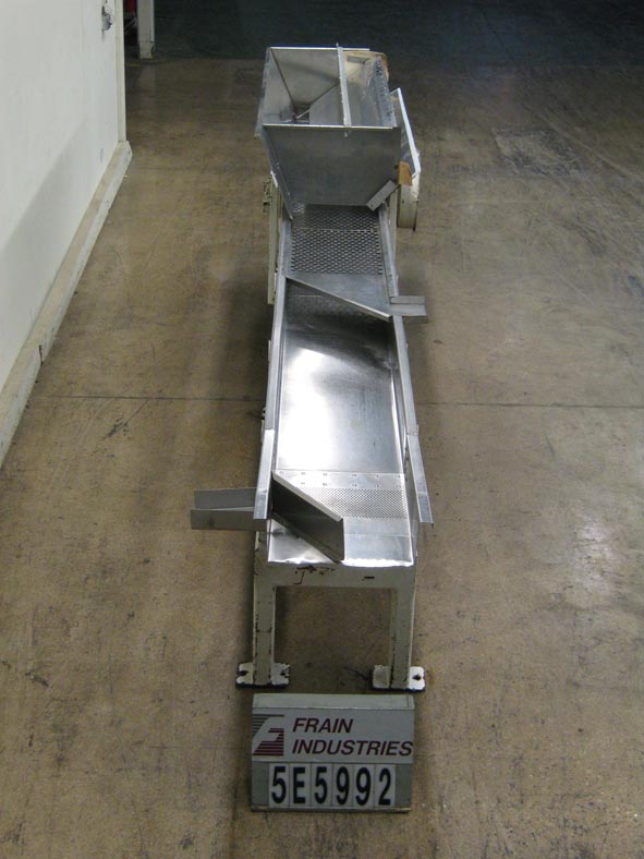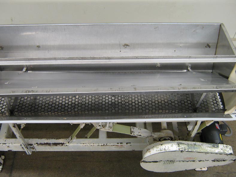 Back to All EquipmentVibratory, sizing, separation and feed conveyor system. 228" L x 18" W x 6" D, single deck vibratory conveyor has a 79" L x 36" W x 24" H, S/S, split product feed hopper, and top 144" L x 17 1/2" W x 1 1/2" D, S/S, screw on, removable separation screen with 1" dia product sizing holes and left angled oversize product discharge chute. Remaining product drops down to main conveyor section that has a 8" L x 17" W separation section with 1/4" dia sizing holes and right angled undersize product discharge chute, final good product is discharged on left angled product chute at end of conveyor all with 41" floor clearence, 2 hp motor drive with saftey guarding and is mounted on a heavy duty painted base frame, can be used for uniform large / small / right on product separtation without scalping.
