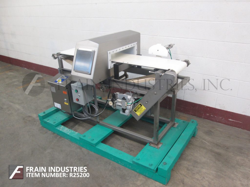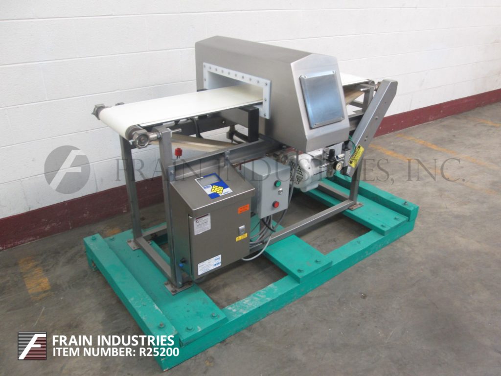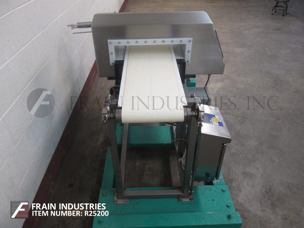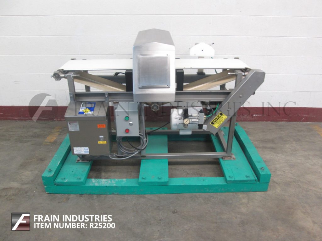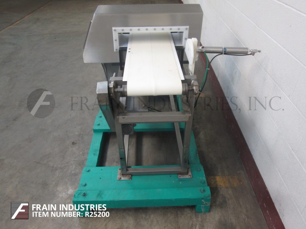 返回所有设备锁,模型洞察力,不锈钢金属探测器。光圈:3英“高; 17英寸”宽,配备11英寸宽X 60“长氯丁橡胶输送带,进料/放电高度和空气喷射拒绝。控制面板有按钮控制器。安装在(4)腿不锈钢与脚轮的基架。
