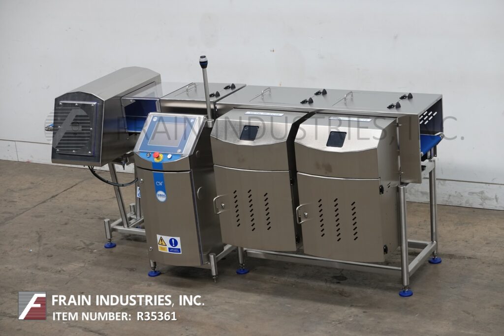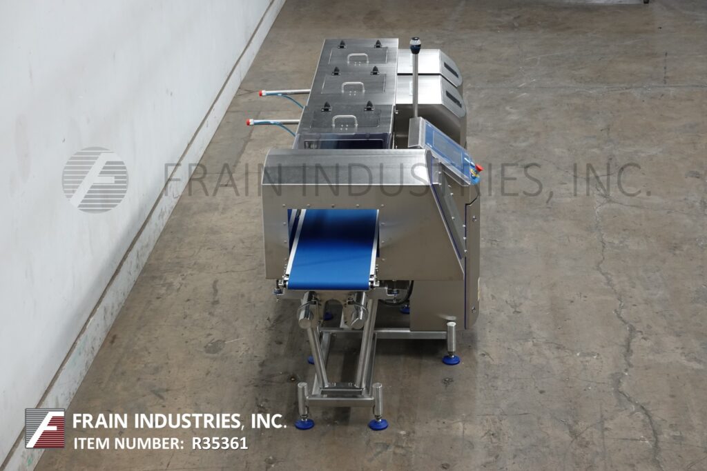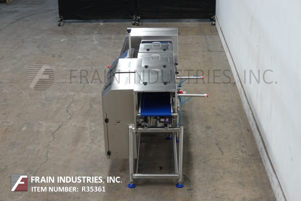 Touch pad controller with LCD display and statis light bar and audible alarm. Features separate weight and contaminant product reject bins. Mounted on stainless steel frames with leveling legs.