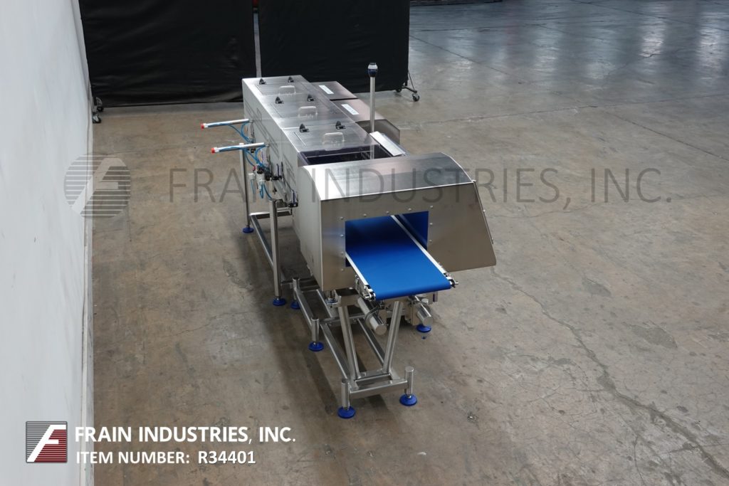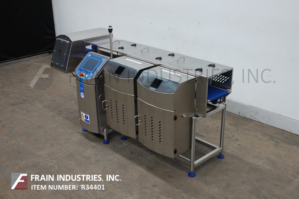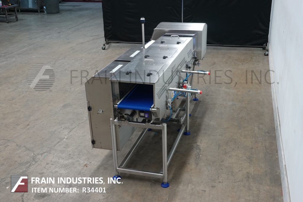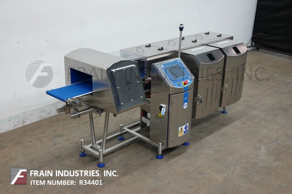 返回所有设备Loma型号IQ4 / CW3-1500,组合金属探测器和检验秤,额定每分钟10至140英尺,产品数量取决于材料和应用。拉丝304不锈钢结构。IQ4金属探测器的工作光圈为6¾“在高度x 13”在宽度和11¾“宽PU蓝色防静电产品带式输送机的灵敏度评级取决于产品,容器和环境运行。CW3-1500 Checkweigher重量范围为10至1500克,精度高达0.6克。15"长负载传感器输送机和51¼"长× 12"宽PU蓝色防静电产品带输送机与ram手臂拒绝,并有单独的重量和污染产品拒绝仓。组合单元的控制面板有触摸屏控制器,LCD显示和统计灯条。安装在不锈钢框架与水平腿。