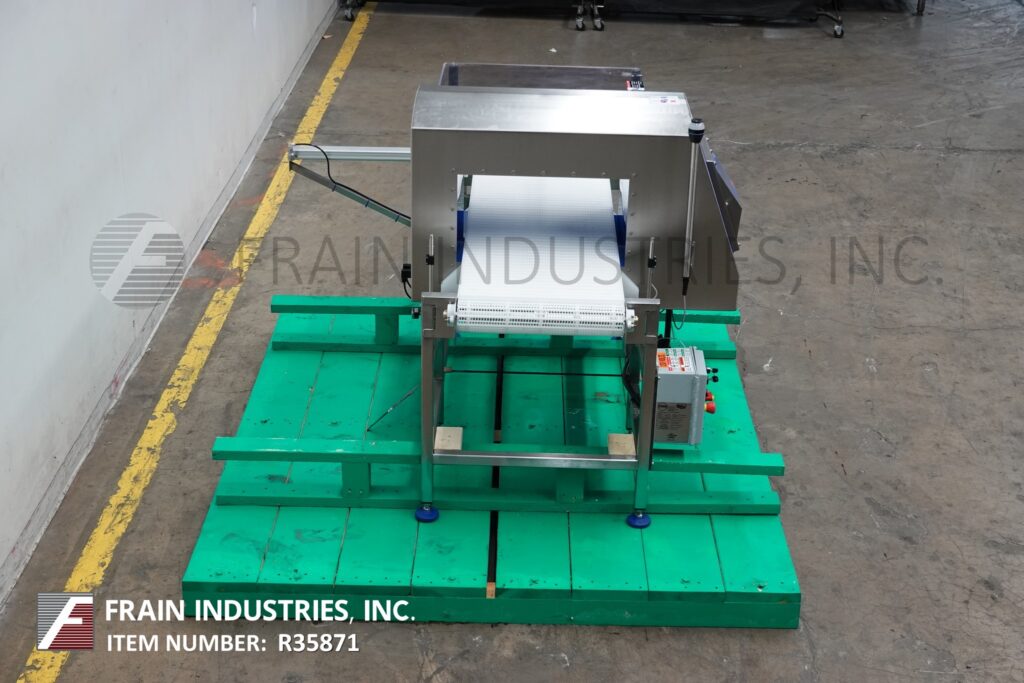Loma, Model IQ4, Automatic, in line, stainless steel, metal detector with number of product per minute – depending on materials and application. Total Aperture: 12" in Height; 21½" in Width. Working Aperture: 10½" in Height; 19½" in Width. Equipped with 20" wide x 72" long Intralox product conveyor belt and is 34" to 38" adjustable in feed and discharge height, with ram arm reject, 7" color touch screen controller with user interface, start, stop, e-stop push button controls and signal tower. Sensitivities: depending on product, container and environment being run in. Temperature range: -10 to +40 Deg C, 14 to 104 Deg F. Ethernet and USB capable. Mounted on stainless steel frame with height adjustable legs.