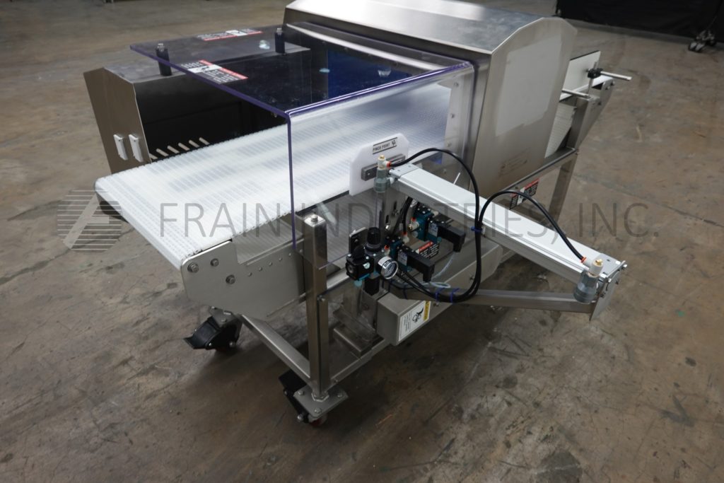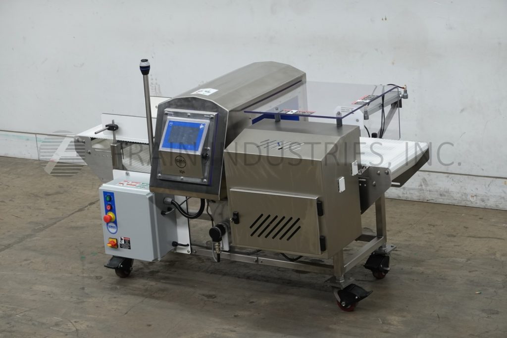 Back to All EquipmentLoma, Model IQ4, automatic, in line, stainless steel, metal detector with number of product per minute – depending on materials and application. Working Aperture: 6" in Height; 17" in Width. Equipped with 15¾" wide x 70" long Intralox product conveyor with push arm reject and variable speed controls. Sensitivities: depending on product, container and environment being run in. Temperature range: -10 to +40 Deg C, 14 to 104 Deg F. Ethernet and USB capable. Touch pad controls with display. Mounted on (4) leg base frame.