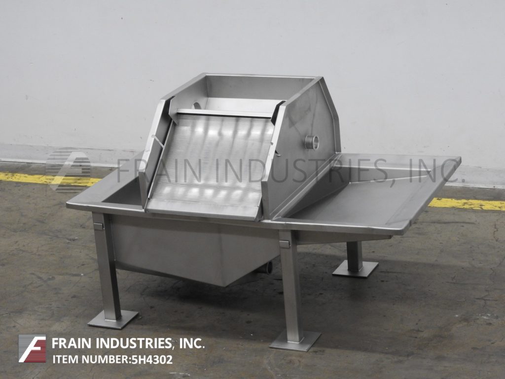 Back to All EquipmentNew England, stainless steel, 60 ft³, bulk hopper / incline feeder. Equipped with 68" wide x 60" long x 30" deep product hopper, 34" wide x 32" long live bottom conveyor, 18¾" wide white flexlink conveyor with 2" high cleats on 12¼" centers with a 45" vertical run and 22" horizontal run and 58" discharge.