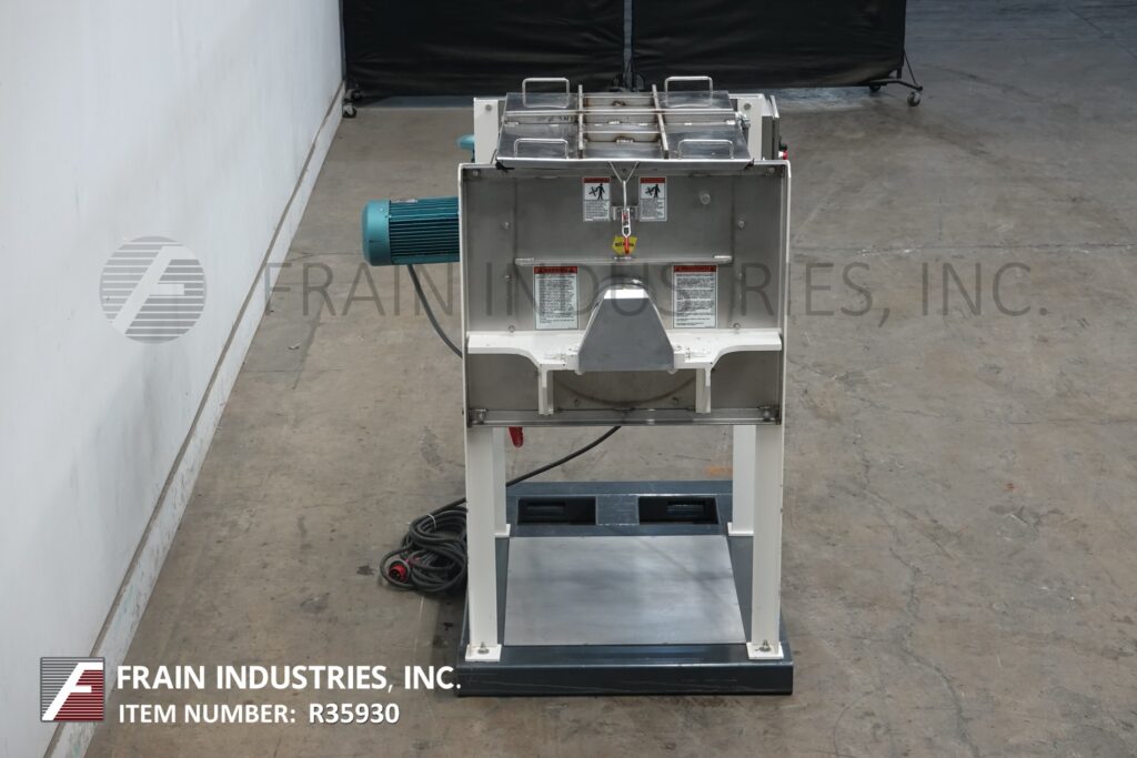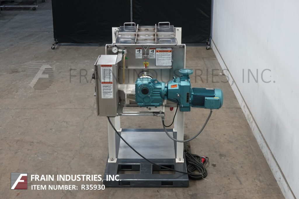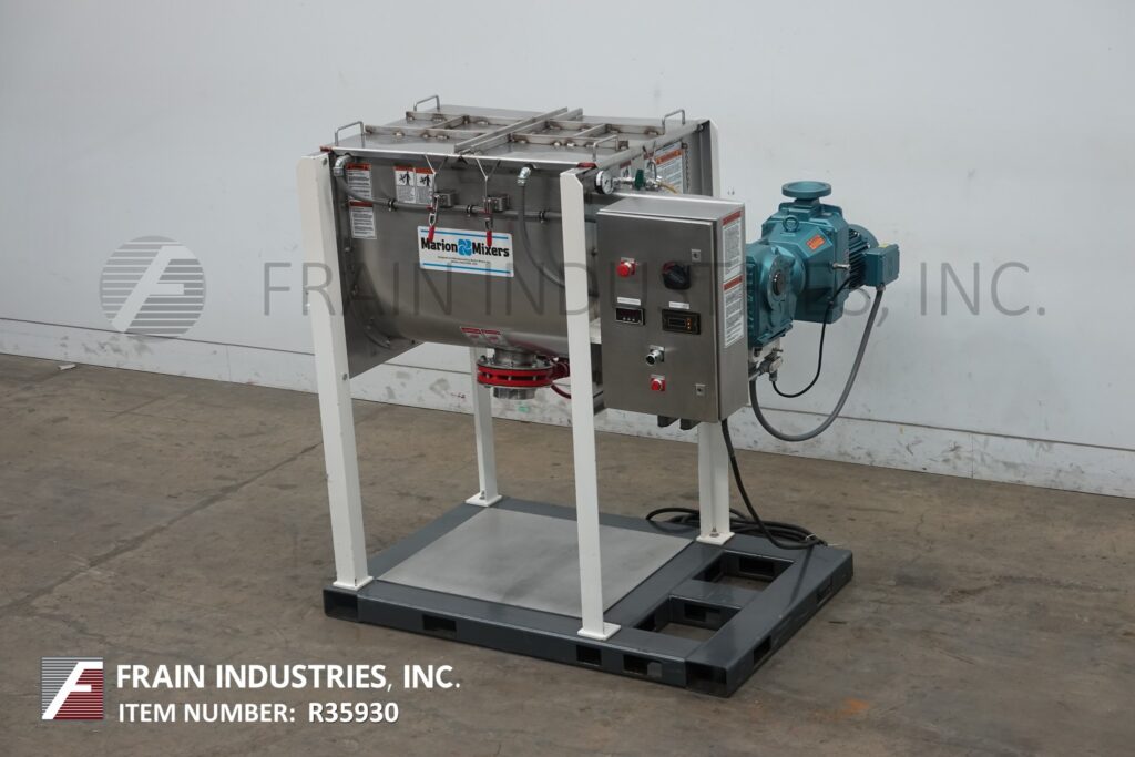 Back to All EquipmentMarion, 11 ft³ total, 10 ft³ working capacity, 316 stainless steel paddle mixer with lbs of product per hour – depending on materials, application and machine configuration. Inner chamber dimmensions: 36" in Length x 24" In Width x 25" in Depth. Equipped with clamp down cover, liquid spray bar, 3" OD shaft with 14" long x 5" wide paddles. 6" diameter center bottom discharge with slide gate valve and 25" floor clearence. 7½ Hp motor drive with variable speed gearbox. Mounted on (4) leg painted forklift base frame.