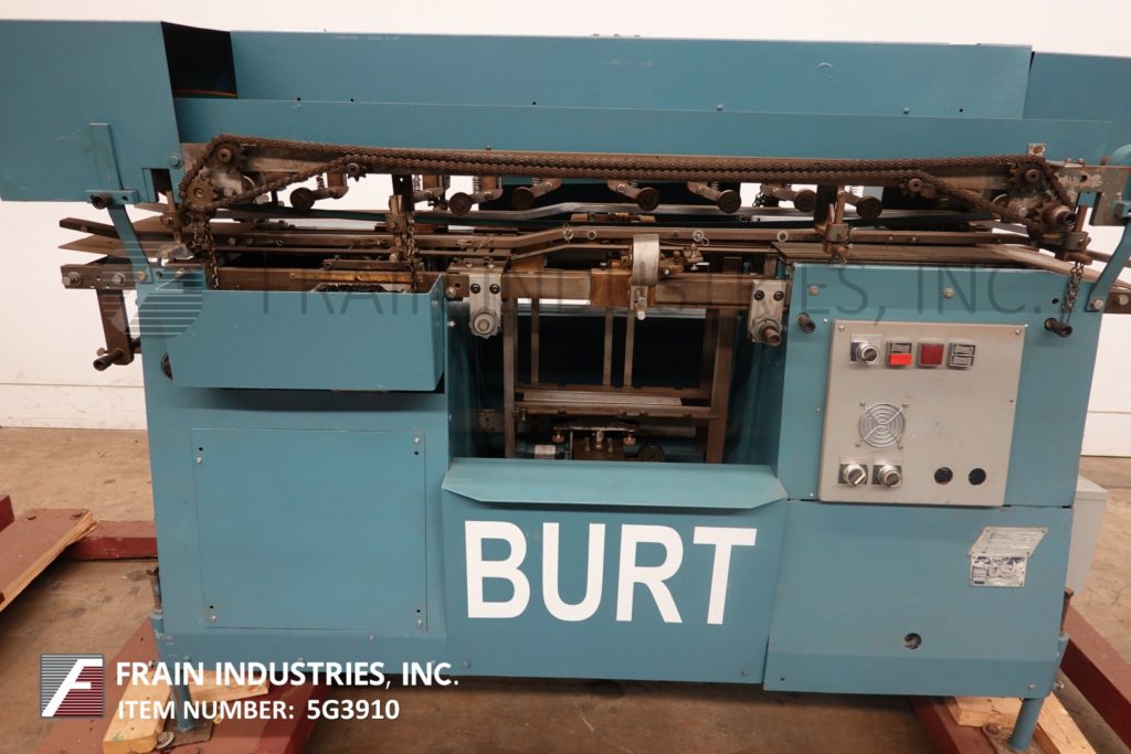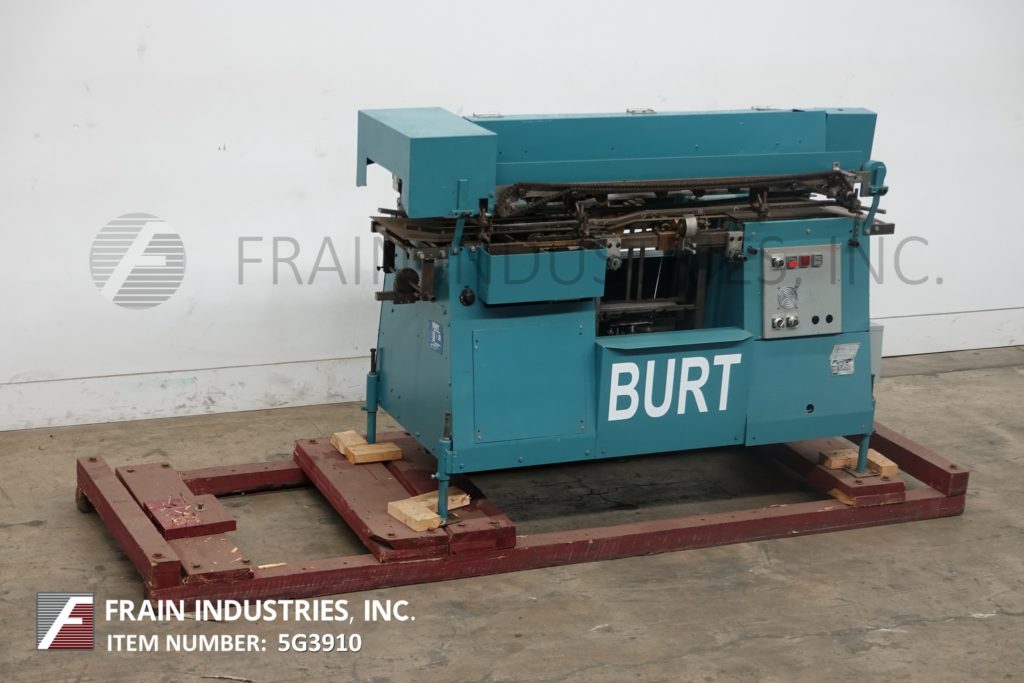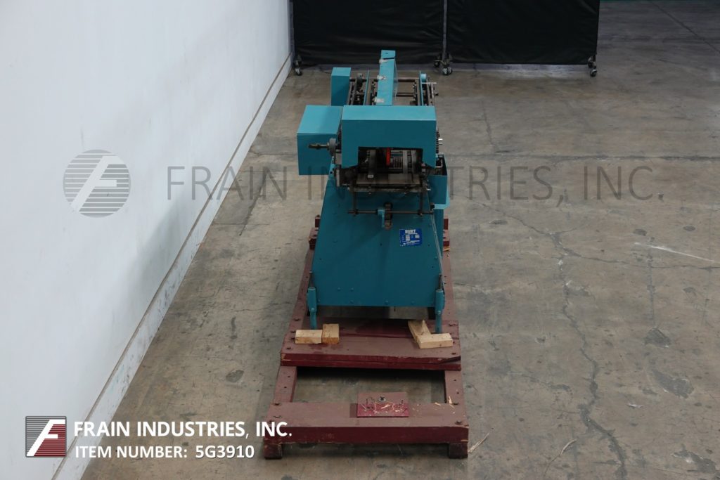 Back to All Equipment伴侣Burt, Model 408, automatic roll through glue labeler. Rated from 50 to 600 containers per minute – depending on materials and application. Container size range: 1¾" to 4½" In Diameter x 1-9/16" to 10½" in Height. Label size range: 4-5/8" to 15" in Length x 1¼" to 9¼" in Width. Equipped with hydraulic lift label magazine, 5/8" gripper belt, hot glue pot with direct container contact finger applicators, cold band lap seal, has machine and label feed start / stop push button controls.