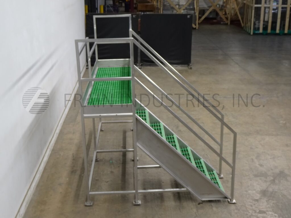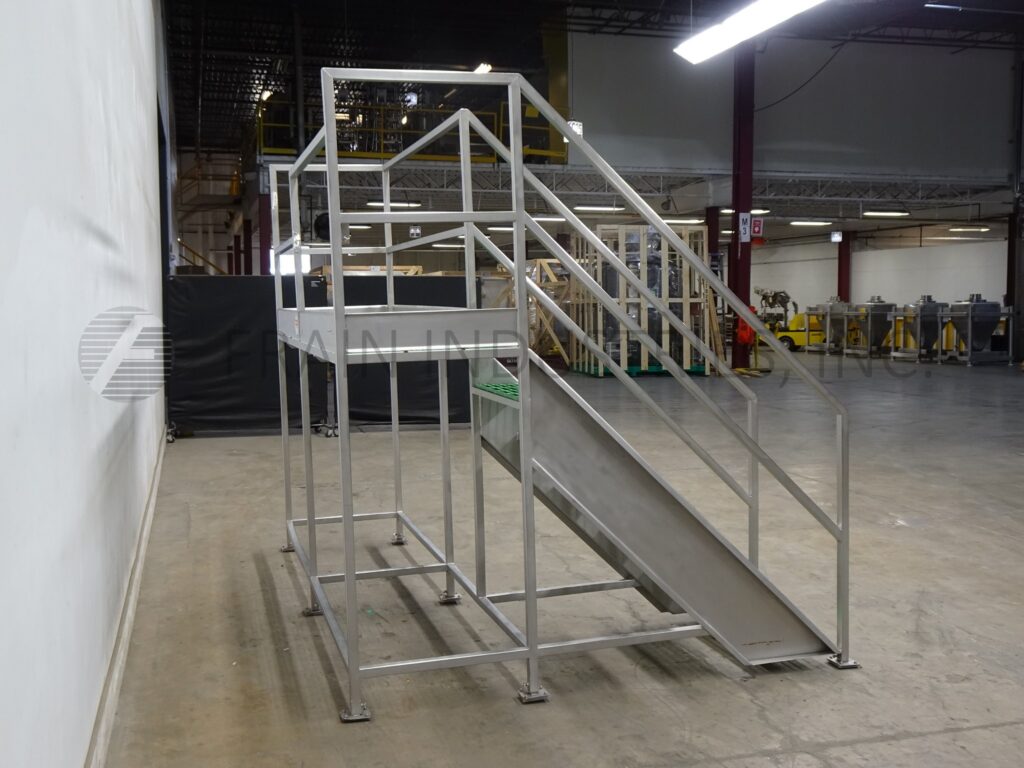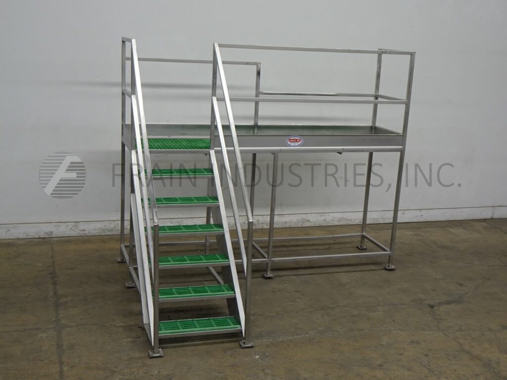 Back to All EquipmentStainless steel mezzanine equipped with a 120" x 30" standing platform set 57" off the ground, (6) step staircase and 34" high guard rail.