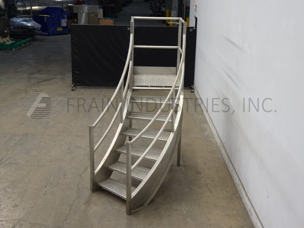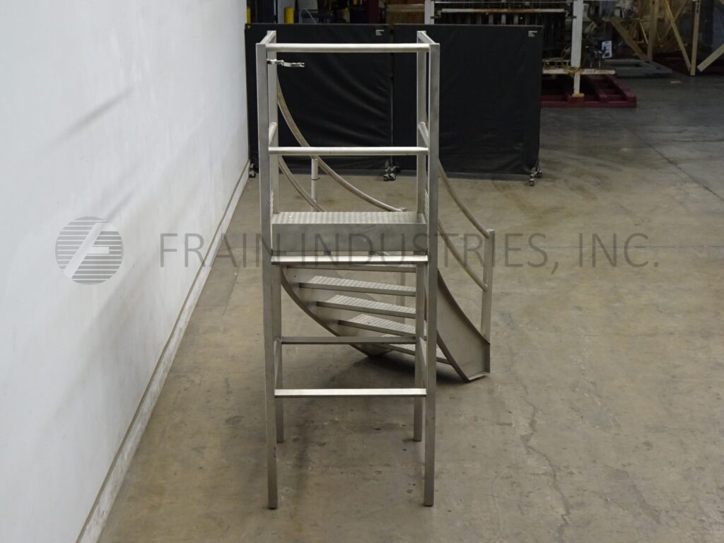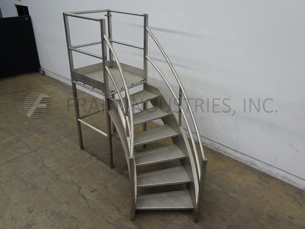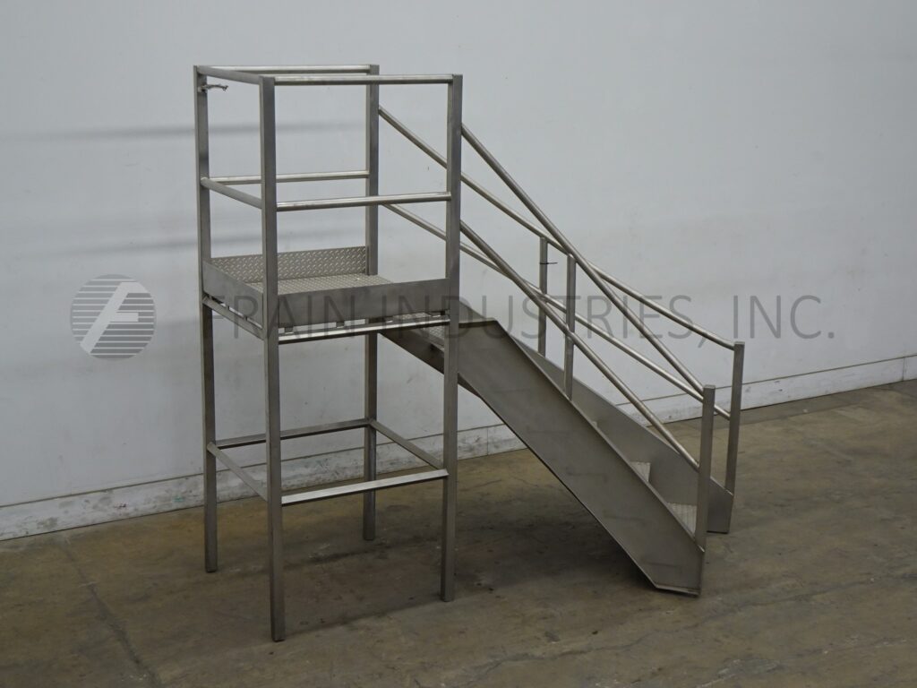 Back to All EquipmentStainless steel wrap-around mezzanine equipped with a 35" wide x 36" long standing platform set 57" off the ground, (6) step staircase and 41" high guard rail from platform. Mounted on leveling legs.