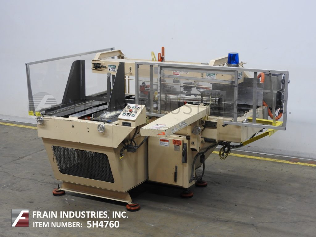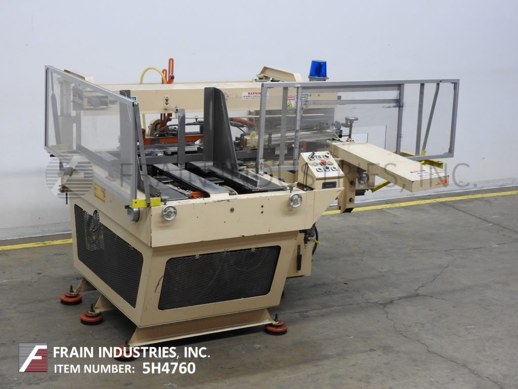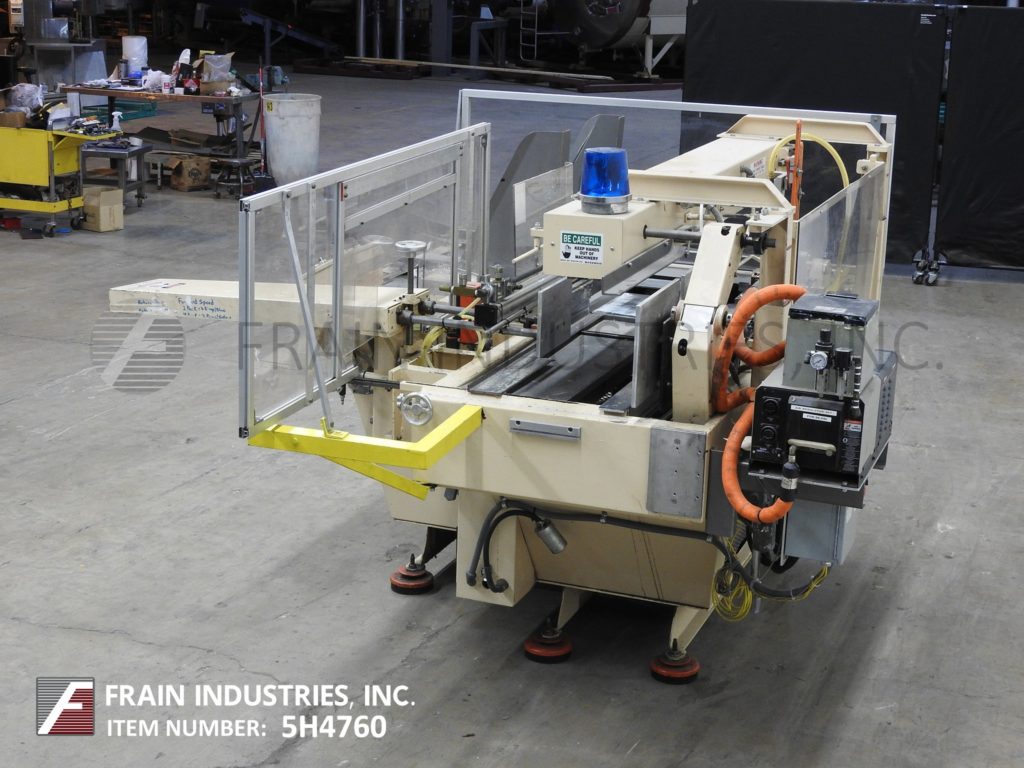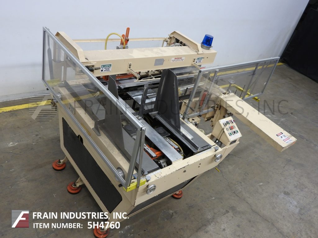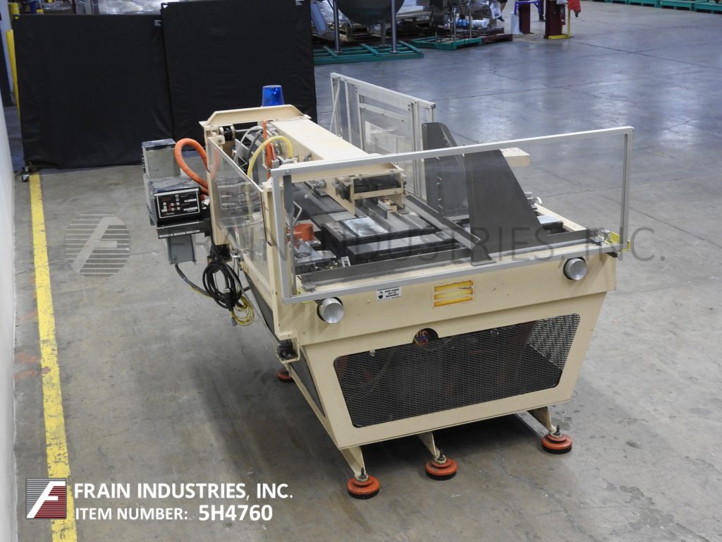 返回所有设备McDowell型号201RH,自动装箱安装机,热熔胶底封机,额定每分钟5到30箱-取决于材料和应用程序5-3/4"至24"宽度;深度10到33英寸。能够处理HSC和HSC内置分频器,RSC, AFM, FOL和蜡涂层纸箱。配有26"长空白盒杂志,是手曲柄可调,机械往复位置和盒安装部分,热熔胶单位,底部主要和次要皮瓣关闭和单ram臂压缩部分气动高度可调的支柱。控制面板开/关,手动/自动循环开关,启动,停止,上升,下降和e-stop按钮控制,运行统计灯。安装在基础框架与水平腿。