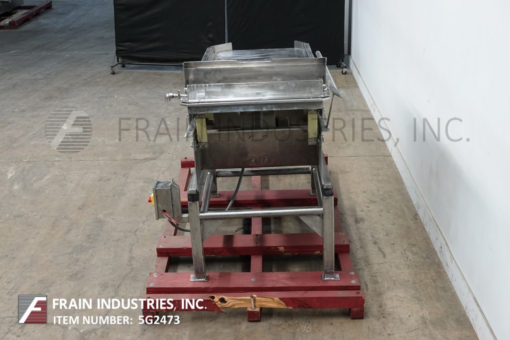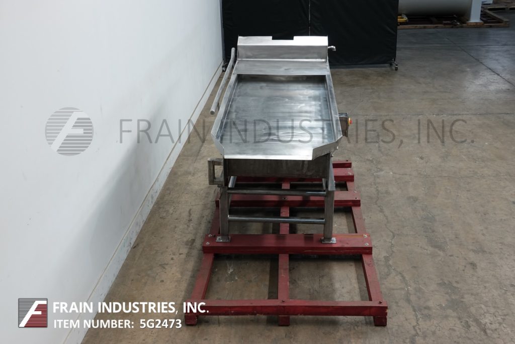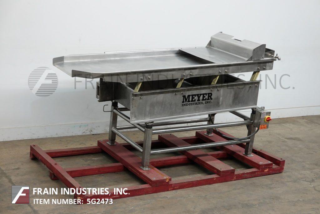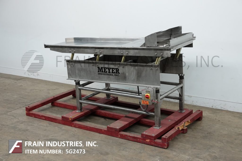 Back to All EquipmentMeyer, stainless steel vibratory conveyor. Equipped with 34"wide x 112"long bed with 2¾" sidewalls. Quadra Eccentric vibrator driven by 1hp gearmotor and A-B enclosed disconnect switch. 45"high outfeed and 51"high infeed with 1/2"diameter x 34"long water spray pipe. Unit is mounted on a 69"long x 40"wide x 24"high stainless steel frame stand.