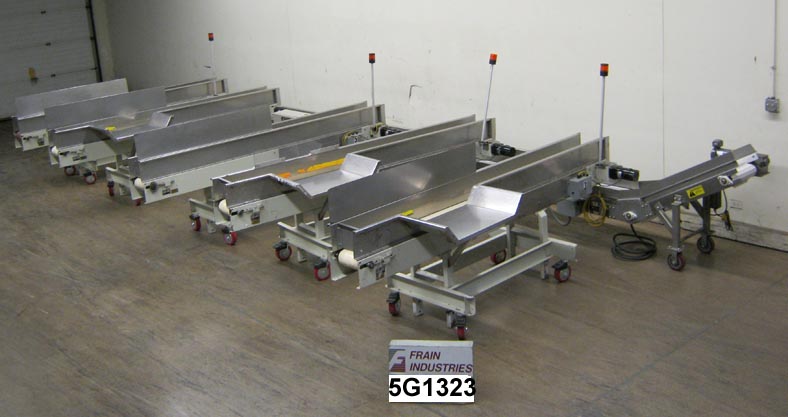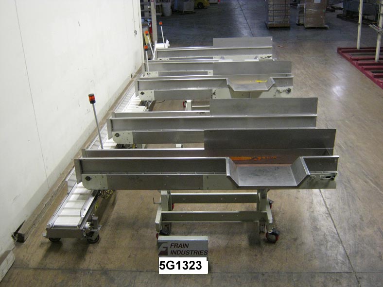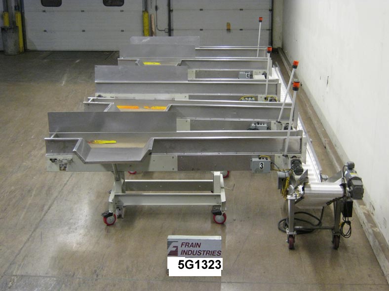 返回所有设备迈耶型号HPB12B,输送产品“混合系统”额定高达160英尺每分钟产品数量-取决于材料和应用。配备了(5)120英寸长x 8英寸宽不锈钢开箱输送机,将其送入30英寸长x 17英寸宽斜面cleated积累输送机,17英寸宽x 2英寸高cleats设置在12英寸中心。(5) 34" x 18"开箱站,不锈钢导轨,状态灯和48"高放电。每个安装的独立框架与锁定脚轮。