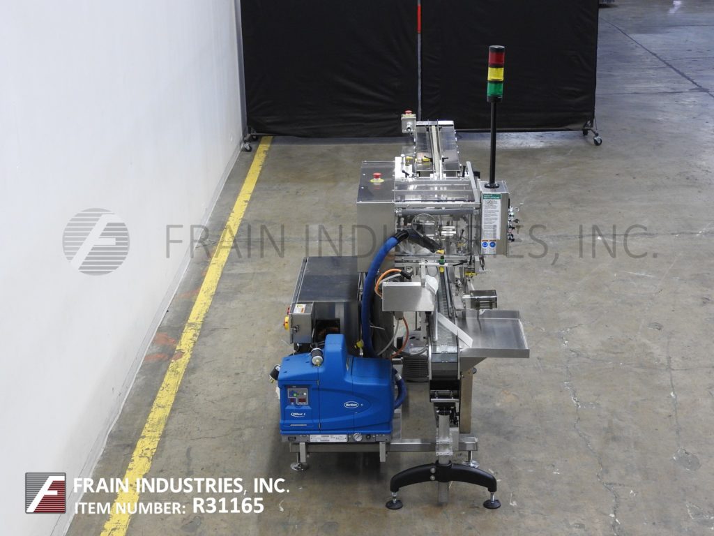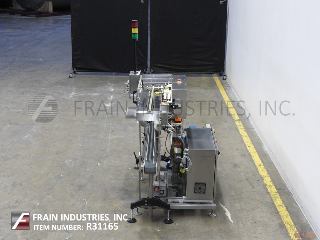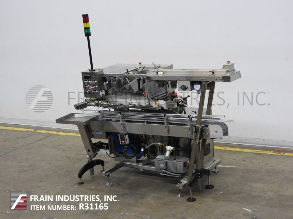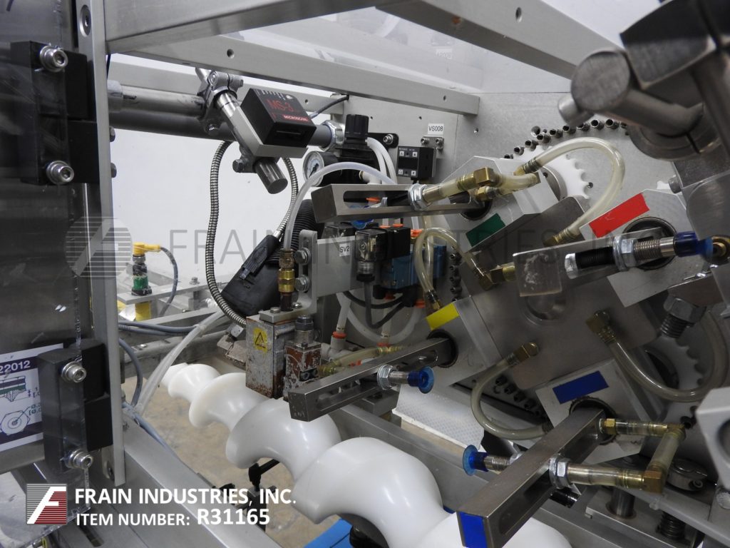 返回所有设备MGS RPP-42IT型顶部分拣机,自动,不锈钢,4头旋转式分拣机,每分钟60至600次-取决于材料、应用和机器配置。产品尺寸范围:高1英寸至7英寸,宽1英寸至12英寸。配备42“长x 3/4”宽动力试片盒、带独立真空泵和压力表的螺杆式产品定时指示器、数字计数器和Nordson热熔胶系统。控制面板有A/B PLC,带数字读数、真空、胶水和模式开/关/旁路开关,有启动、停止和多个带statis灯条的急停按钮。安装在不锈钢框架上,带水平支腿和安全防护装置。容器通过旋入式进料定时,并自动从杂志中拾取传单,同时将胶水涂在容器顶部,并将传单放置在胶水顶部。