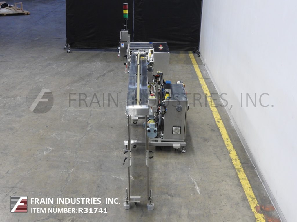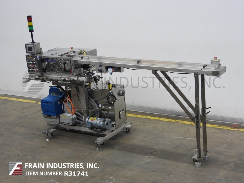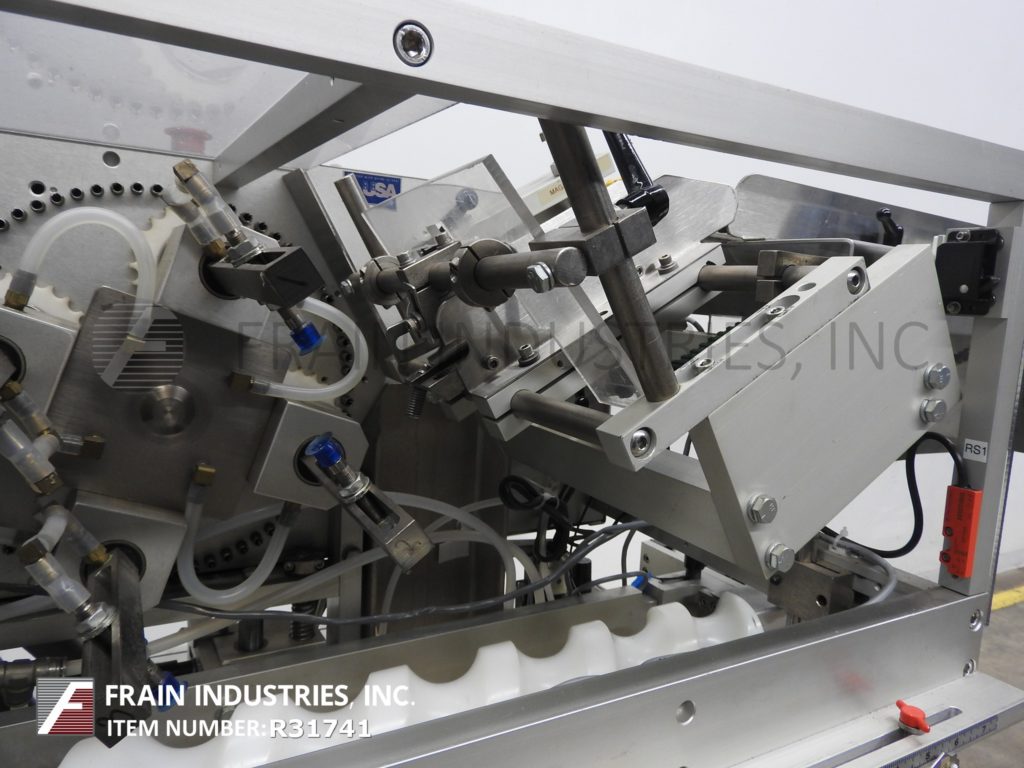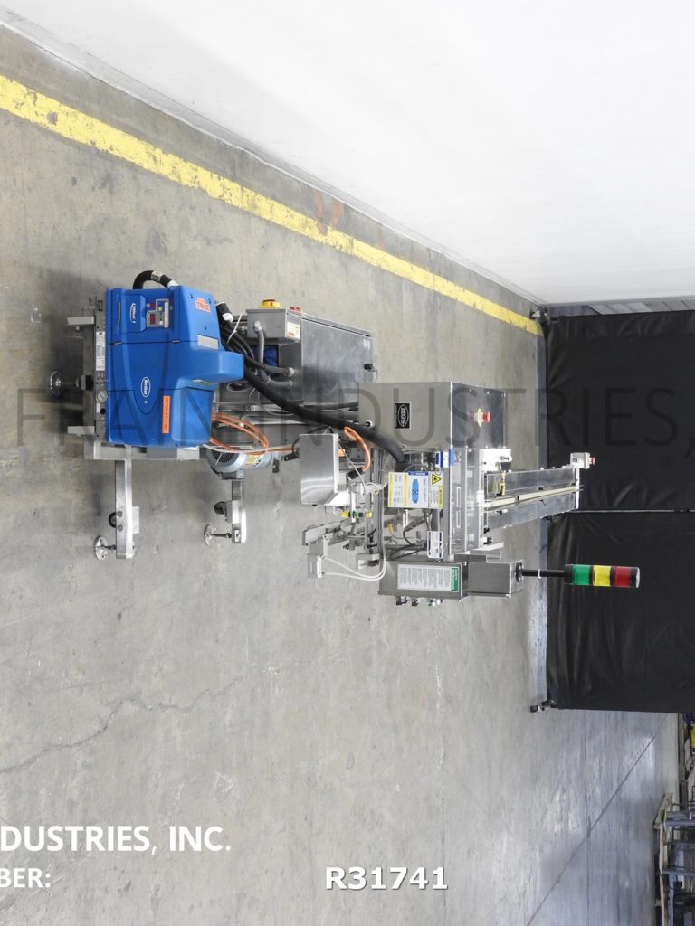 Back to All EquipmentMGS Model RPP-42IT Top Sorter, high speed (4) head rotary, pick and place coupon feeder rated from 40 to 240 cycles per minute with timing screw and number of coupons – depending on materials and application. Product size range: 1.12" to 2" in Width; 1.12" to 2" in Height and .06" to .75" thick with (4) heads. Equipped with 90" long x 3/4" wide x 1" high single coupon magazine, (4) head rotary vacuum suction cup pick n place, 42" long feed screw, Nordson Problue hot melt glue system and vacuum pump. Control panel has bypass, run mode, glue and vacuum on / off, pitch small, large switches, barcode teach, fault reset, main drive on and e-stop push button controls, Mounted on "H" style base frame with safety guarding, casters, leveling legs and statis light bar.