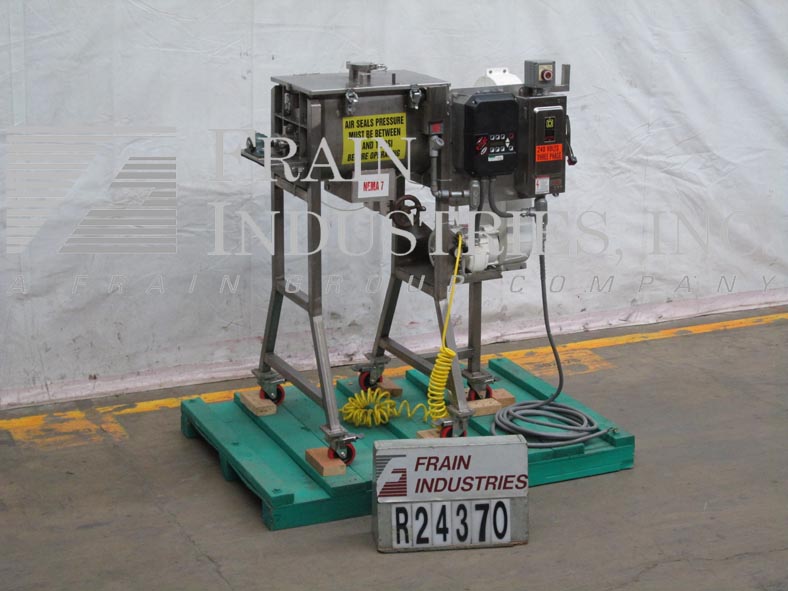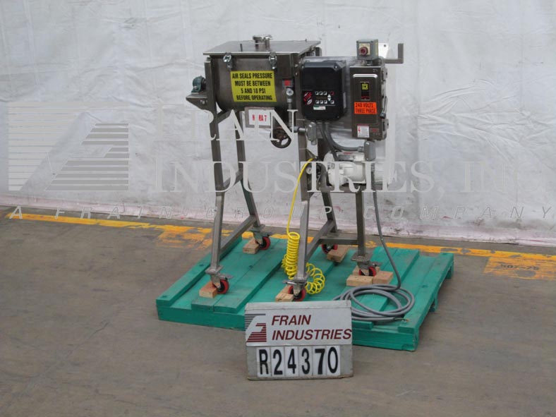 返回所有设备1.5英尺³,304不锈钢,双带搅拌机。混合室尺寸:长度19.5英寸;12“宽;15“深度。配备一个翻转取缔覆盖3.5“OD顶部中心网站端口,1.25”OD轴,1”宽(外)和1.25“宽x(内部)升至0.5“厚不锈钢丝带上设置“OD辐条,E-Trac AC逆变器,和一个3”OD中心底部卸货港与手动曲柄闸阀。安装在带脚轮的不锈钢框架上。