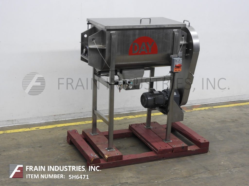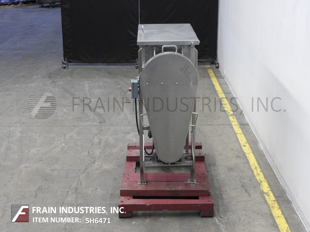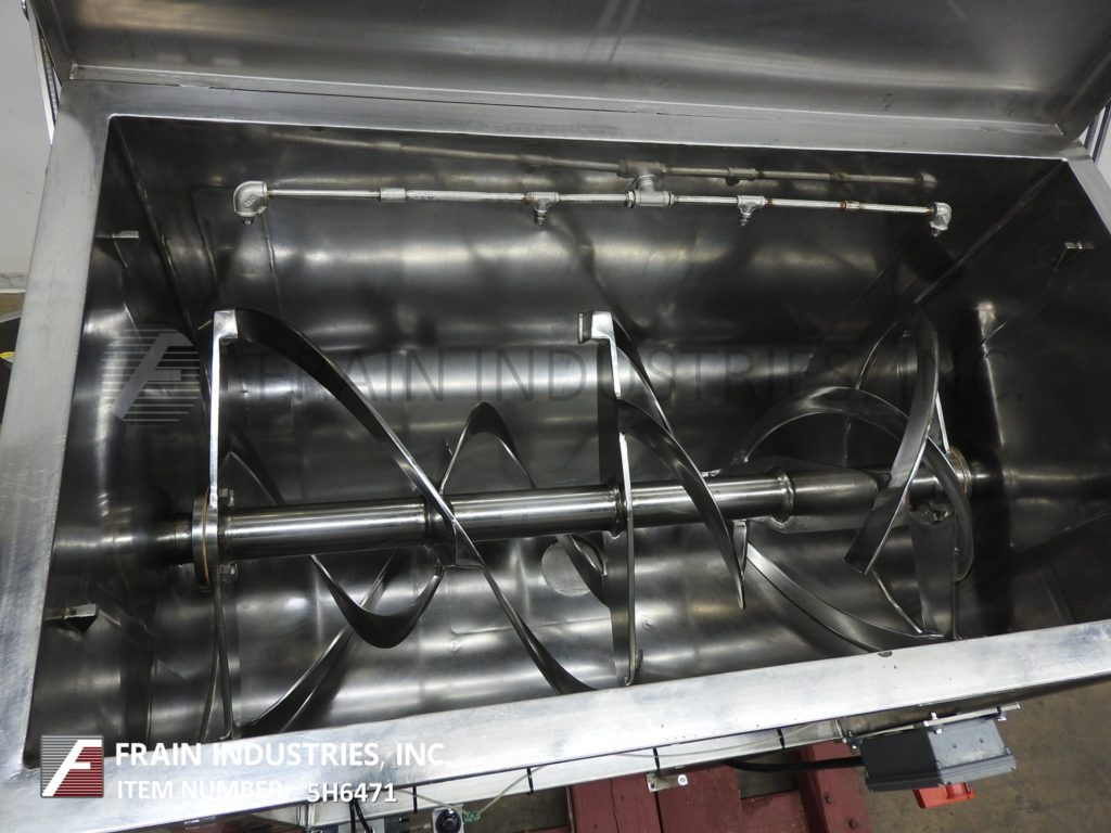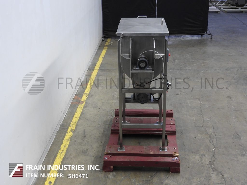 Back to All Equipment10 ft³, double ribbon mixer with pounds of product per hour – depending on materials and application. 304 stainless steel contact parts with Inner mixing chamber dimensions of: 43" in Length; 22" in Width; 25" in Depth. Equipped with lift up cover, lift out safety grate, (4) nozzle spray bar, 2¼" OD mixing shaft with 1½" wide x ¼" thick (outer) and 1½" wide x (1/8)" thick (inner) stainless steel ribbons. 4" OD center bottom discharge with pneumatic slide gate and 8" x 8" discharge chute with 36" ground clearence. Mounted on (4) leg frame with casters.