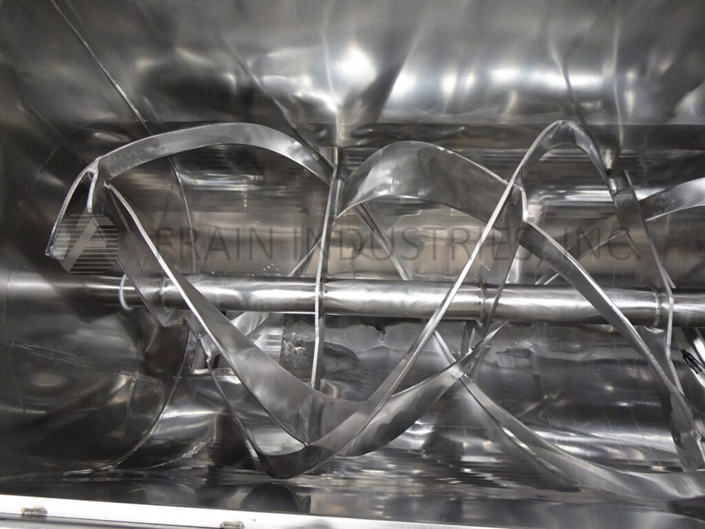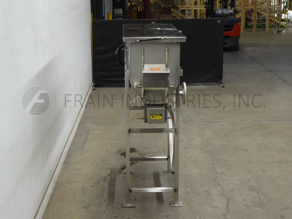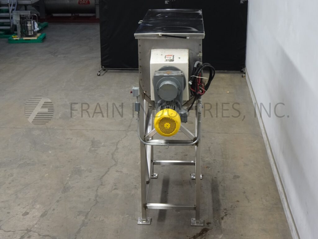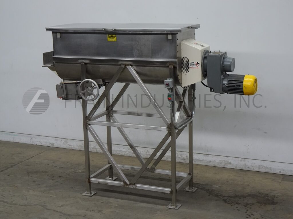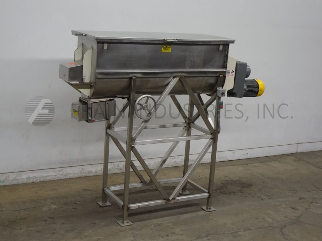 Back to All Equipment22 ft³, (20 ft³ working capacity), double ribbon mixer with pounds of product per hour – depending on materials and application. 304 stainless steel contact parts. Inner mixing chamber dimensions of 72" in Length; 24" in Width; 30" in Depth with a 18" straight wall. Equipped with flip up cover, lift out safety screens, 2½" OD motor shaft, 1½" wide x ¼" thick (outer) and 2" wide x ¼" thick (inner) stainless steel ribbons. 8" x 8" bottom discharge with 62" floor clearence and Eriez magnetic separator. Mounted on stainless steel (4) leg frame.