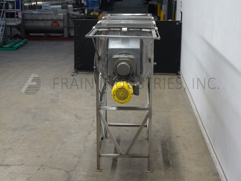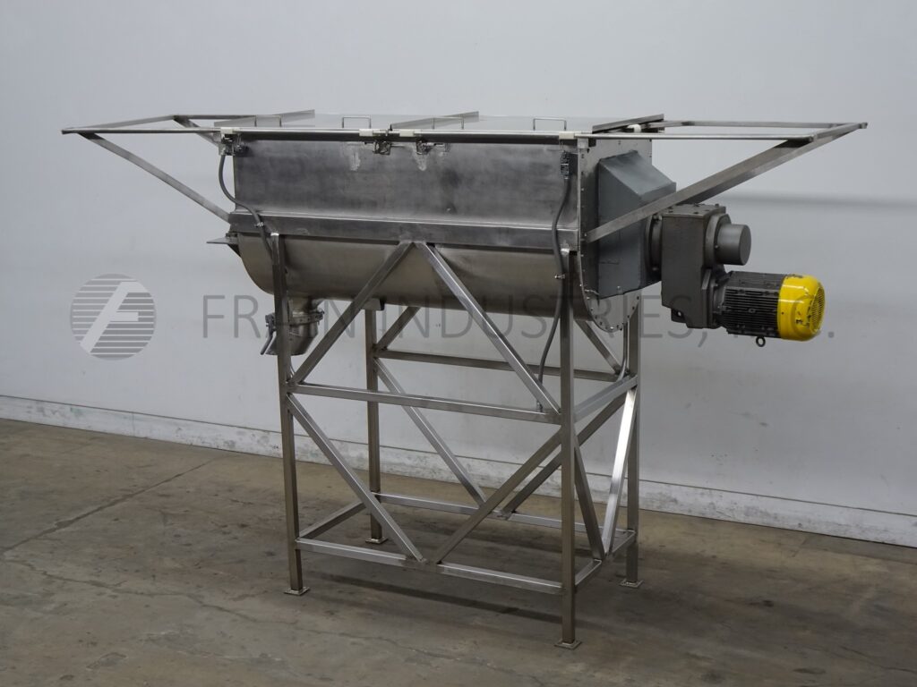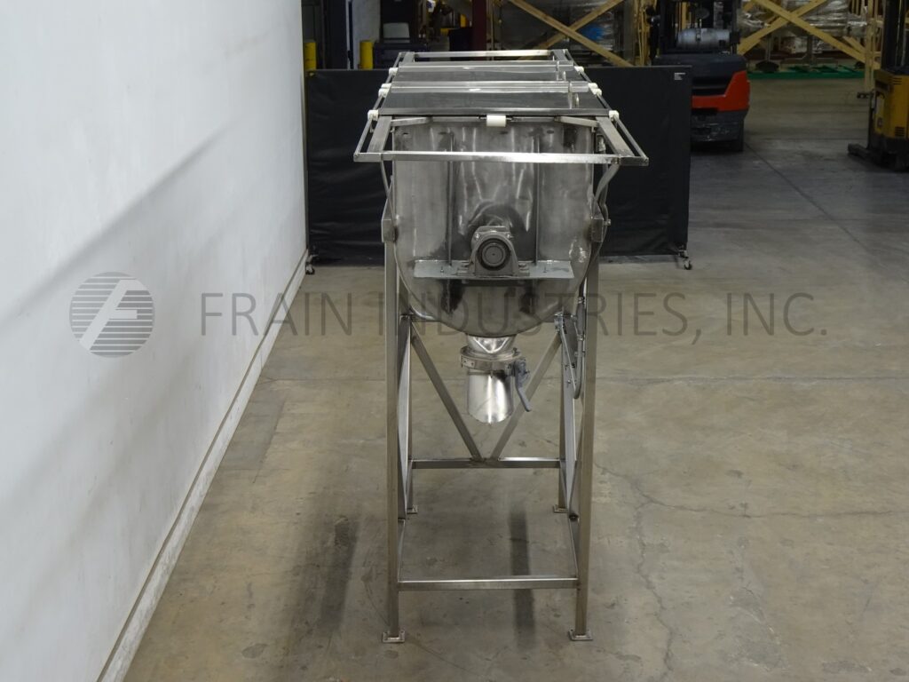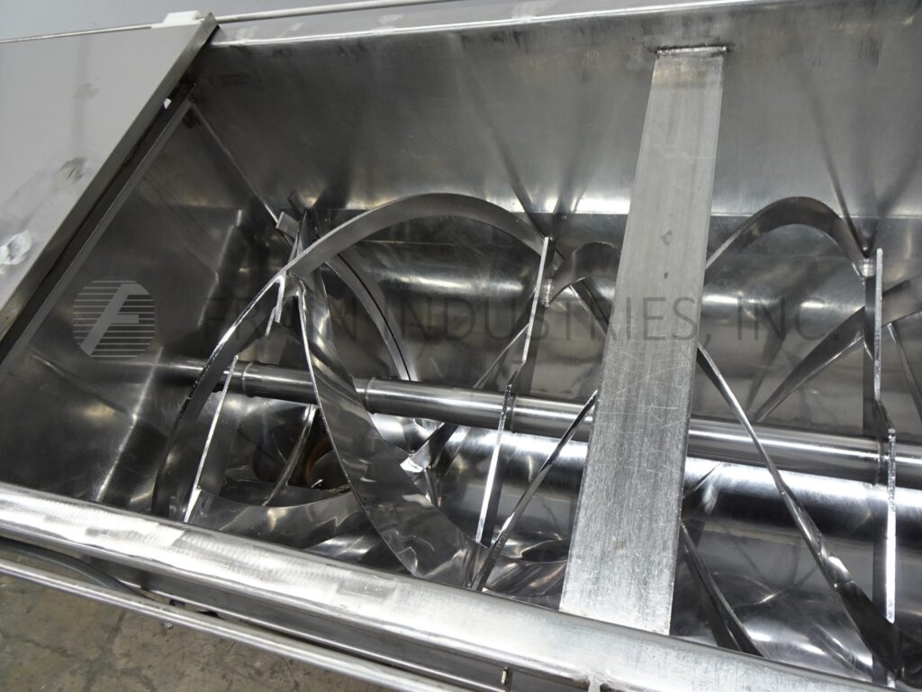 Back to All Equipment40 ft³, (35 ft³ working capacity), double ribbon mixer with pounds of product per hour – depending on materials and application. 304 stainless steel contact parts. Inner mixing chamber dimensions of 76" in Length; 32" in Width; 36" in Depth with a 21" straight wall. Equipped with sliding cover, lift out safety screens, 3" OD motor shaft, 1½" wide x ?" thick (outer) and 4¼" wide x ¼" thick (inner) stainless steel ribbons. 8" OD bottom discharge with 58" floor clearence and 15 Hp motor. Mounted on stainless steel (4) leg frame.