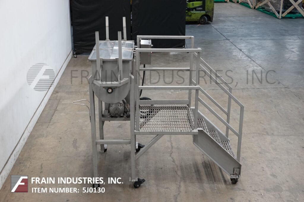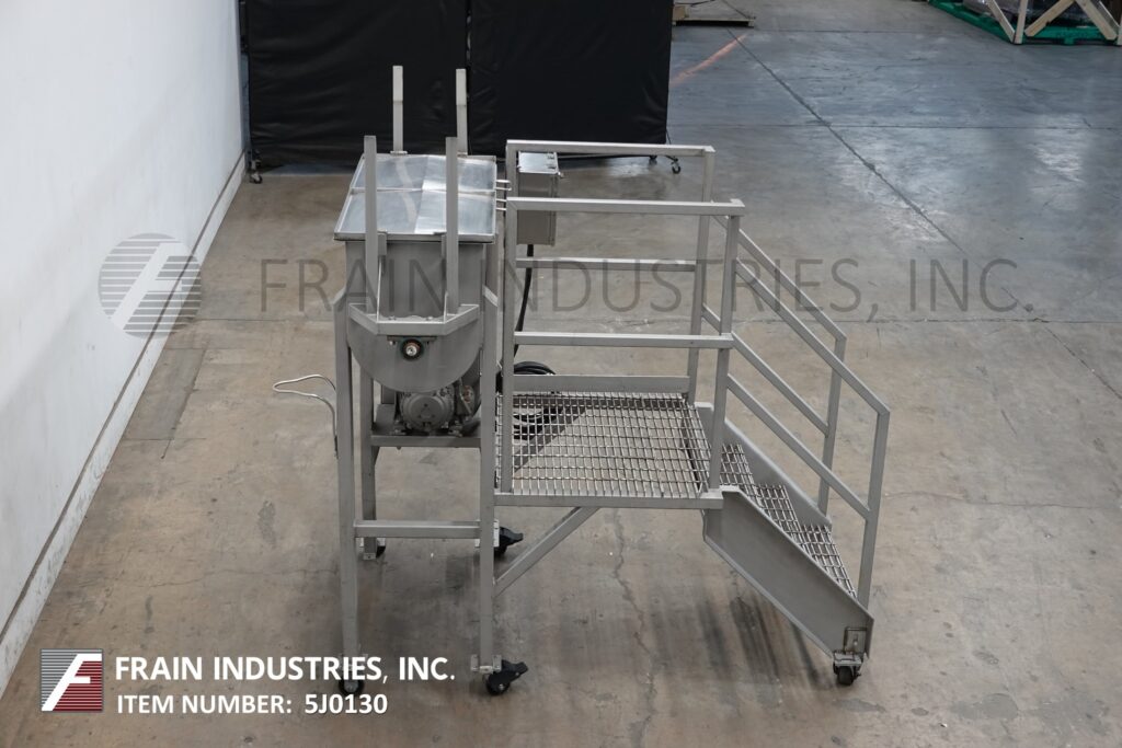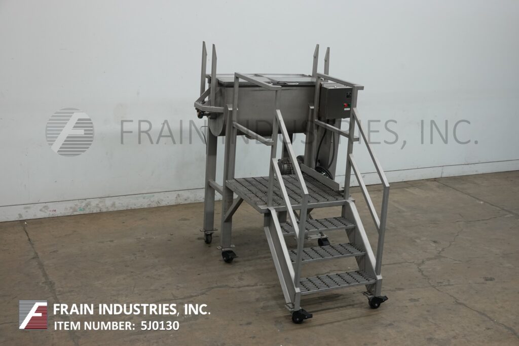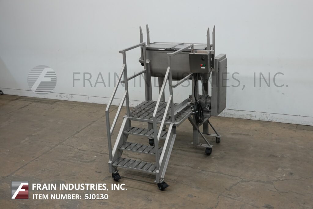 返回所有设备10ft³(7ft³的工作能力),双带混合器,每小时磅产品 - 取决于材料和应用。304不锈钢接触零件。内部混合室尺寸为43英寸的长度;宽度18英寸;22英寸深度。配备翻转盖,提起安全屏幕,1½英寸OD电动机,1“宽x¼”厚(外)和1(1/8)“宽x¼”厚(内部)不锈钢丝带。3“ OD中心底部放电,带滑门阀和49”地板清除。由1.5 hp电动机提供动力。安装在不锈钢(6)腿框架上,带有40“ x 32”的站立平台。