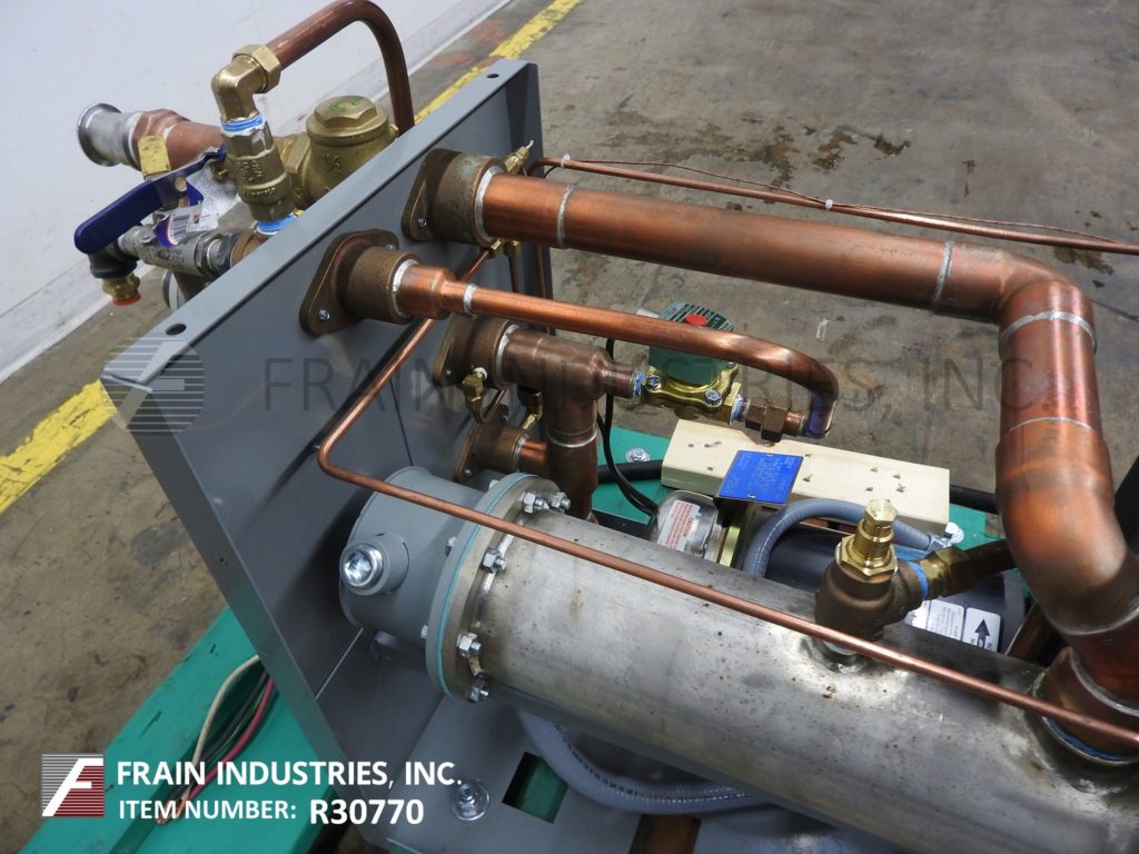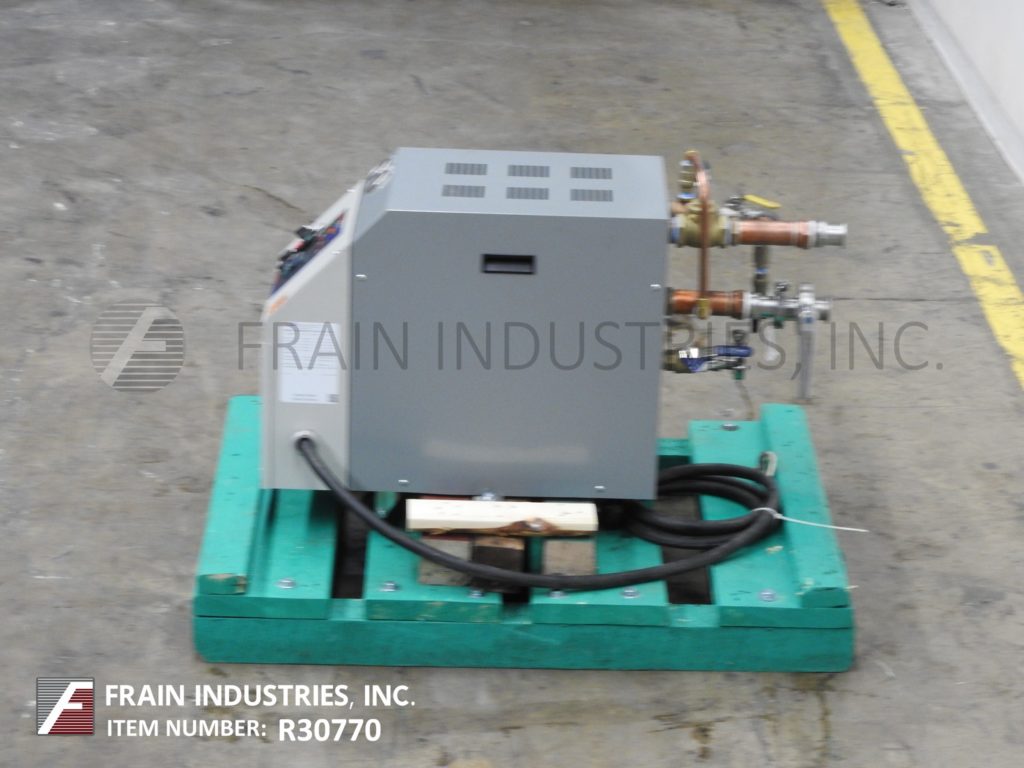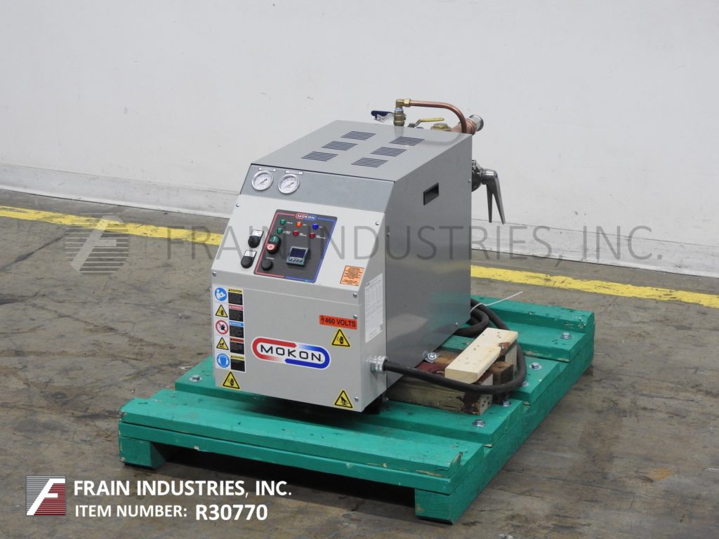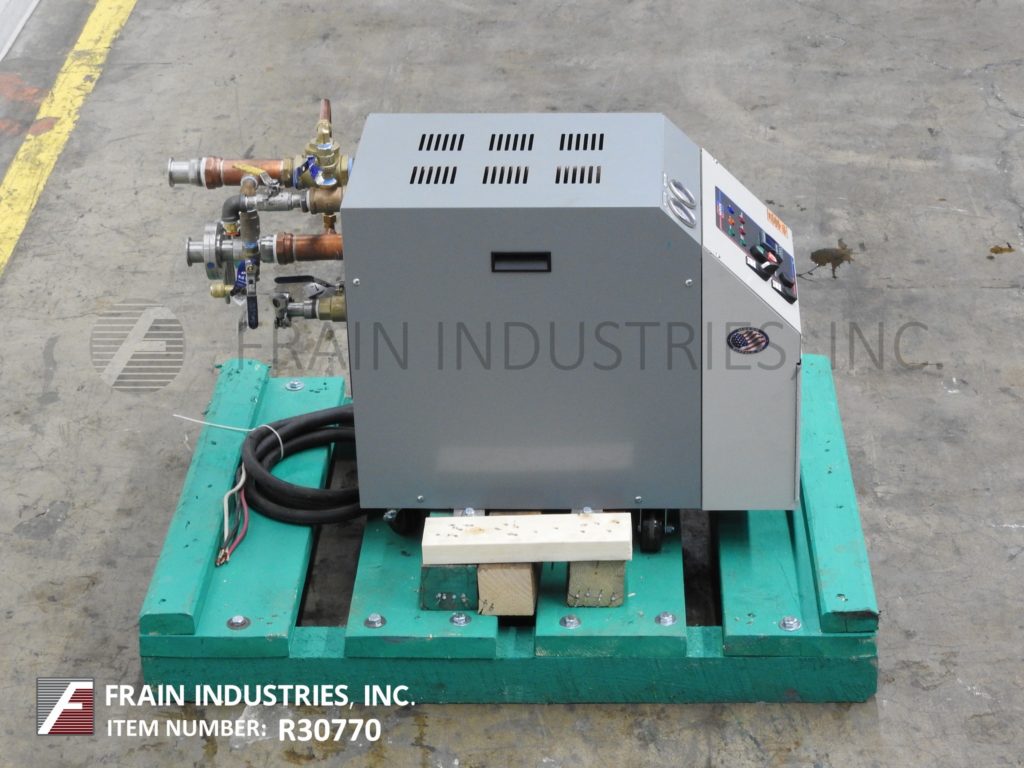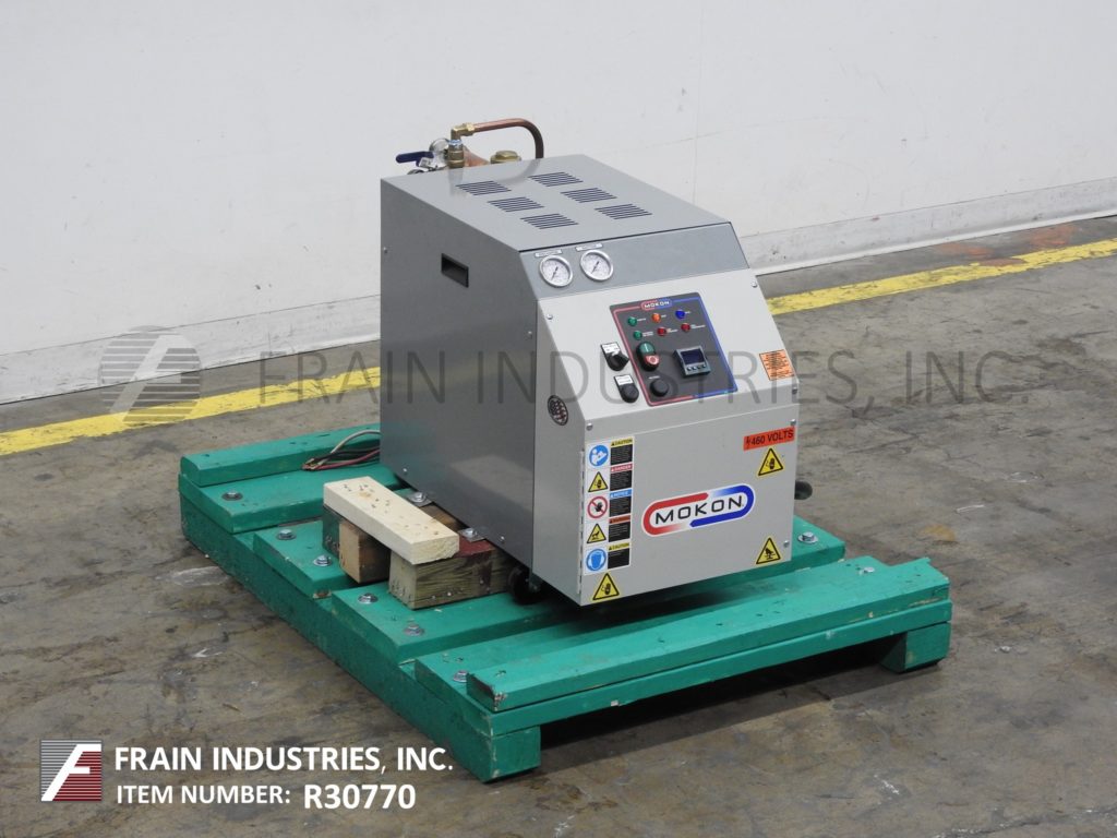 返回所有设备Mokon型号DR系列DR4018AFW, 9kW - 18kW循环热水器,额定最高温度为250°F,在32psi下最高可达40加仑/分钟。配备不锈钢泵壳,叶轮和轴与碳化硅密封,1.5 Hp ODP电机,控制器设有液晶显示设置点和工艺流体温度和自动空气清洗,在启动过程中,有助于减少来自加工线和系统的空气,防止潜在的有害空气袋形成,10英尺电源线和环氧粉末涂层机柜提供内部组件保护,安装在可移动的脚轮上,便于移动。