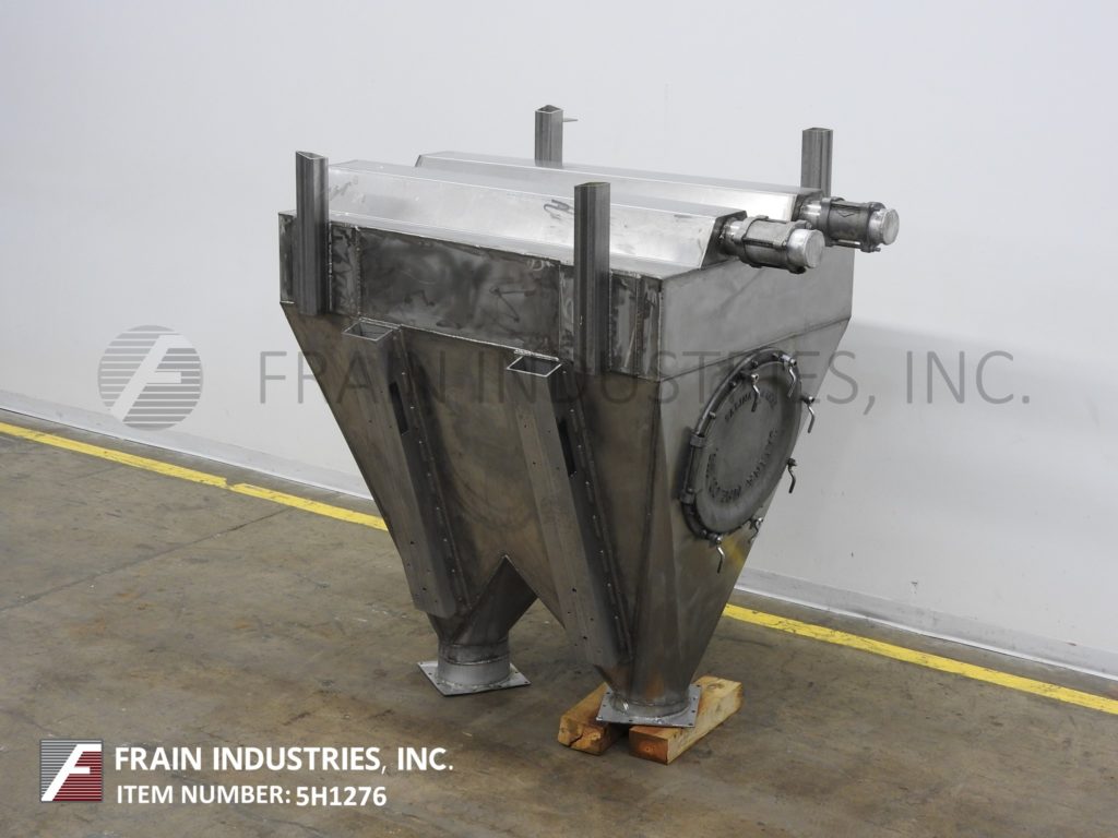 风车式的Model DSM2000, continous, stainless steel, powdered, granulated or cinnamon sugar rumbler for donut coating system rated from 500 to 2000 dozen donuts per hour – depending on materials and application. Drum specifications: 24" ID; 88" in Length with 1" long x 1/2" wide inside drum perfs and flip open bolt down cover. Equipped with 36" long in feed chute and 24" ID discharge both have 36" floor clearence, and 10" OD discharge end sugar recycle chute with 63" long x 16" wide x 22" deep stainless steel reclaim suger bin with flip up cover, and inner / outer paddles as well as 4" OD stainless steel bottom feed screw to 80" long incline cleated feeder with 6" wide belt and 1-1/2" hjigh cleats on 6" centers with cover. Mounted on stainless steel base frame.