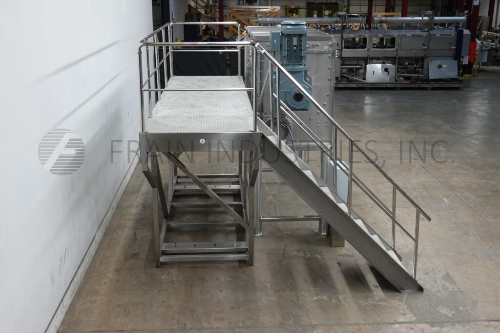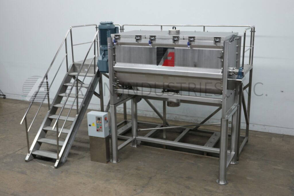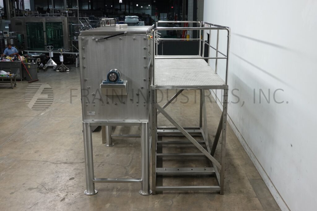 Back to All EquipmentMorcos, Model RM2000, 65 ft³, (60 ft³ working capacity), double ribbon mixer with pounds of product per hour – depending on materials and application. 316L stainless steel contact parts. Inner mixing chamber dimensions of 90" in Length; 36" in Width; 40" in Depth. Equipped with flip up cover, lift out safety screens, 3½" OD motor shaft, 7" OD mixing shaft with 2¾" wide x (5/16)" thick (outer) and 2¾" wide x (5/16)" thick (inner) stainless steel ribbons. 11" OD center bottom discharge with 51" floor clarence and 20 Hp motor. Mounted on stainless steel (4) leg frame with 48" wide x 168" long stainless steel platform with an 8-step staircase.