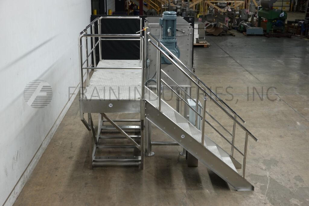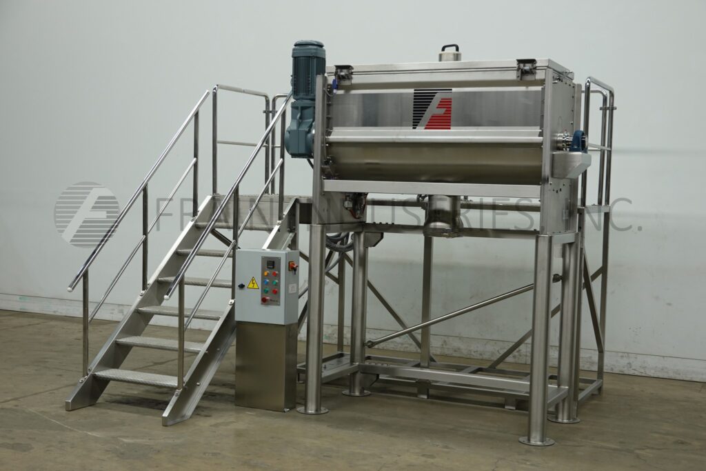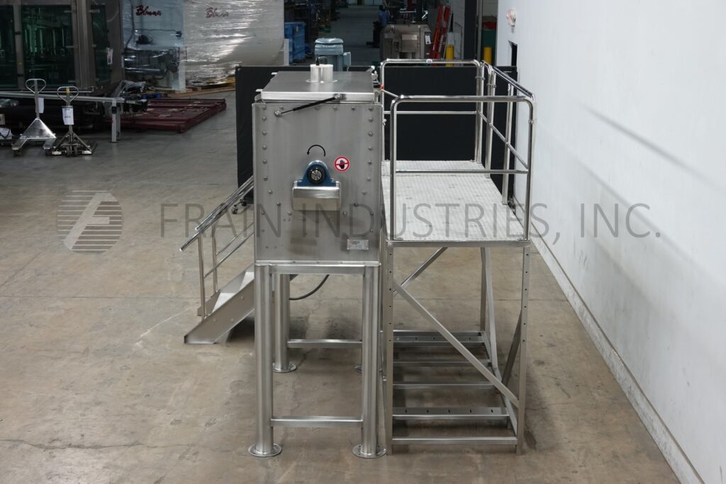 Back to All EquipmentMorcos, Model RM600, 21 ft³, (17 ft³ working capacity), double ribbon mixer with pounds of product per hour – depending on materials and application. 316L stainless steel contact parts. Inner mixing chamber dimensions of 60" in Length; 24" in Width; 26" in Depth. Equipped with flip up cover, lift out safety screens, 2¼" OD motor shaft, 1¾" wide x ¼" thick (outer) and 1¾" wide x (¼)" thick (inner) stainless steel ribbons. 11" OD center bottom discharge with 50" floor clearence and 7.38 Hp motor. Mounted on stainless steel (4) leg frame with 35" wide x 121" long stainless steel platform set 57" off the ground with 36" high rails and a 6-step staircase.