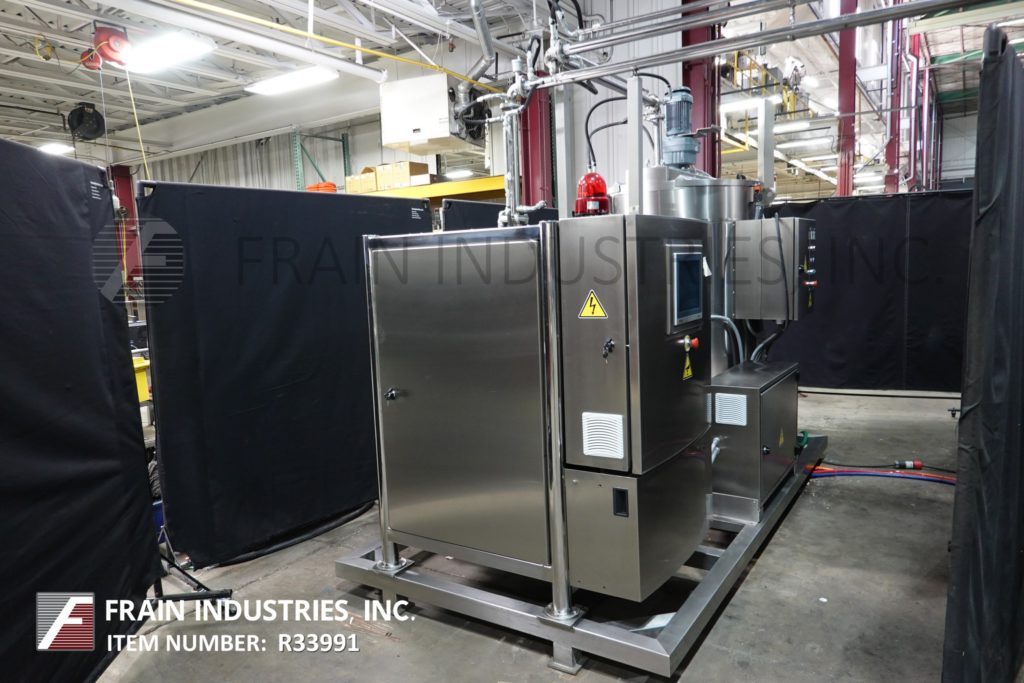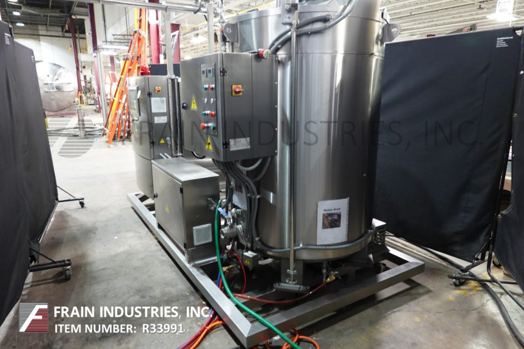 型号AWK 1000, 2200磅,不锈钢,夹套,独立的巧克力熔化罐,每小时产品重量-取决于材料和应用。全护套,带有独立加热器,侧温探头和顶部温度探头以及侧温计。碟底有法兰中心底卸料。安装在(4)不锈钢支腿上。