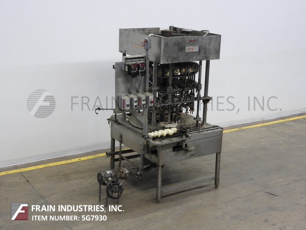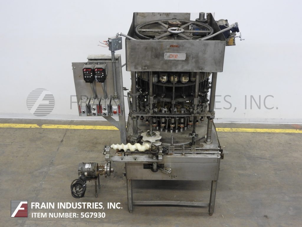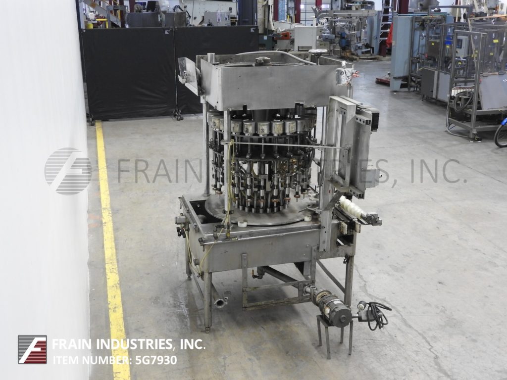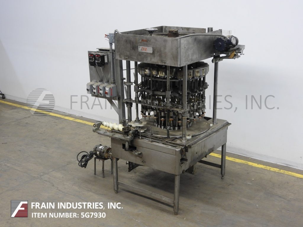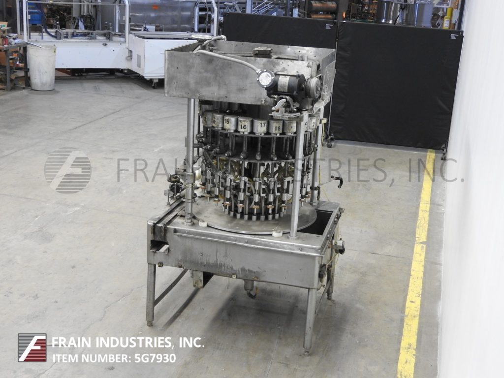 返回所有设备MRM Elgin,全自动,不锈钢,24头旋转压力重力填料。额定从40到240个集装箱每分钟-取决于材料,应用和机器配置。容器尺寸:直径可达3.5英寸,高度可达9½英寸,配有适当的更换部件。配有一个虫螺杆星形砂轮在饲料和星形砂轮排放,38"直径表(24)½"外径不锈钢喷嘴设置在4"中心,离心产品泵,保持罐浮动液位传感器,无容器/无填充和泵和填料的变速控制器。安装在不锈钢底座上,并配有滴漏盘。