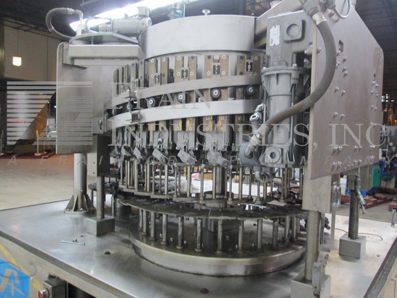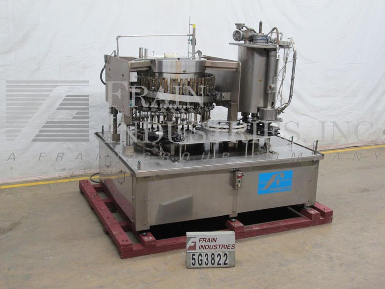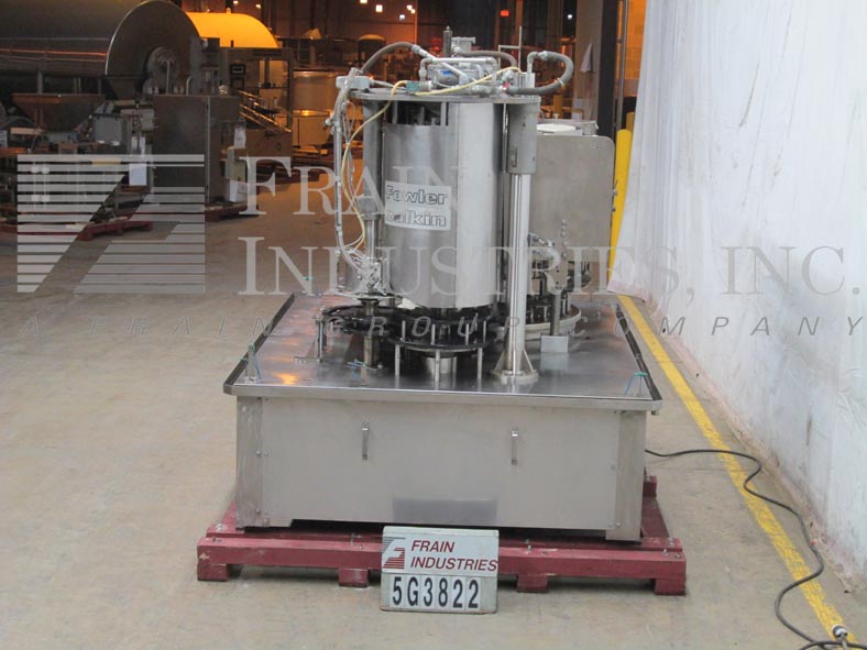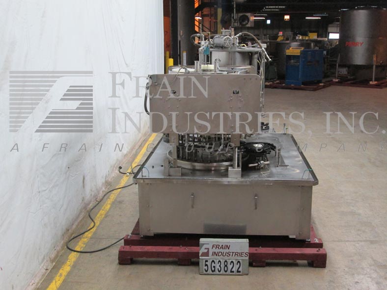 Back to All EquipmentMRM / Zalkin / Fowler Model RPF 30/10, monobloc, piston filler, screw capper rated from 30 to 500 container per minute – depending on materials and application. Maximum container size 4" OD x 11" High and can handle plastic or glass containers with proper change parts (currently set with 32oz pistons) Equipped with star wheel in feed and discharge, 52" OD turntable has 30 bottom up piston filling heads set on 5" centers, with 1/2" OD nozzles and 10 head rotary screw capper. Control panel has start, reset and e-stop push button controls. Mounted on stainless steel base frame.